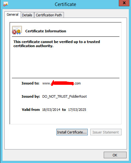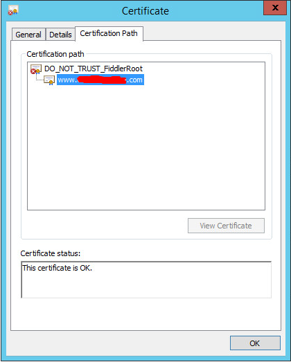 Only while performance testing on iexplorer I get the message that the CA root cert is not trusted because it isn't in the Trusted Root Certification Authorities store. As you can see, the child cert is OK & I don't get the option to install/add the CA root cert to the Trusted Root Certification Authorities store.