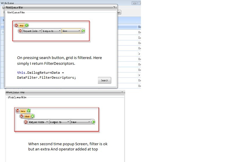 Sorry I can't share source code but i can explain scenarios, I pass gridView.FilterDescriptors to popup screen