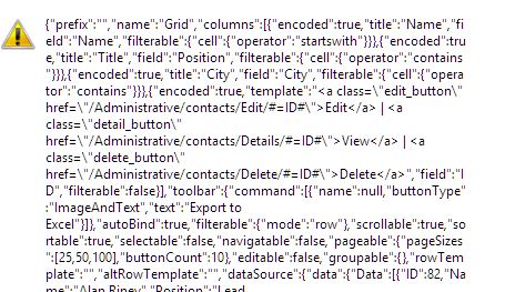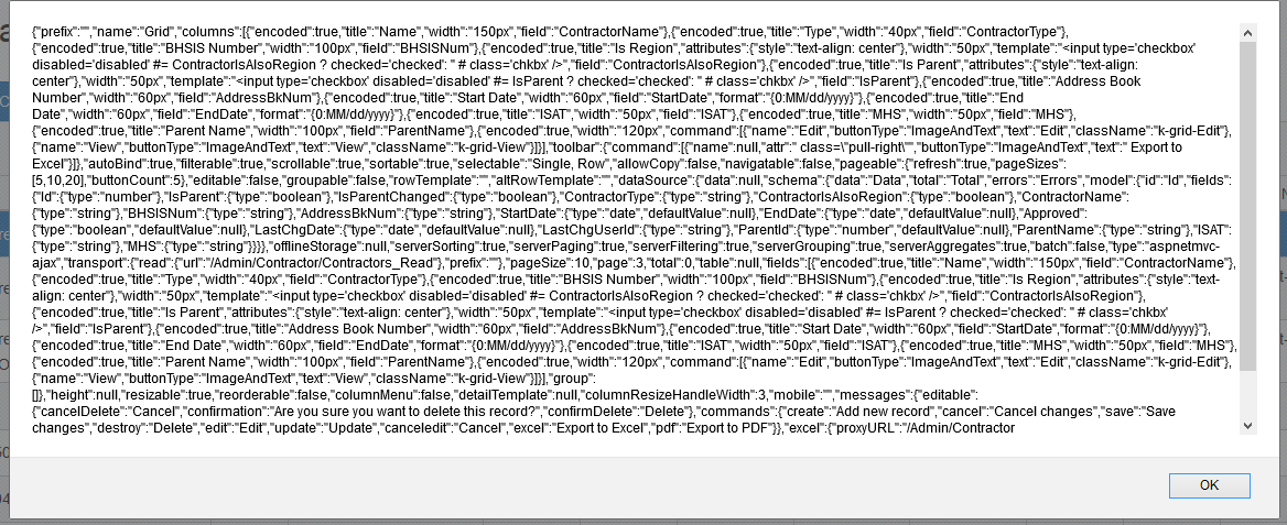 <div class="row"> <div class="col-xs-18 col-md-12"> @(Html.Kendo().Grid<BHEBS.Areas.Admin.Models.ContractorModel.contractor>() .Name("contractorGrid") .Columns(columns => { //columns.Bound(p => p.Id).Filterable(false).Width(50); columns.Bound(p => p.ContractorName).Width(150); columns.Bound(p => p.ContractorType).Title("Type").Width(40); columns.Bound(p => p.BHSISNum).Width(100); ; columns.Bound(p => p.ContractorIsAlsoRegion).Width(50).Title("Is Region").ClientTemplate("<input type='checkbox' disabled='disabled' #= ContractorIsAlsoRegion ? checked='checked': '' # class='chkbx' />").HtmlAttributes(new { style = "text-align: center" }); columns.Bound(p => p.IsParent).Width(50).Title("Is Parent").ClientTemplate("<input type='checkbox' disabled='disabled' #= IsParent ? checked='checked': '' # class='chkbx' />").HtmlAttributes(new { style = "text-align: center" }); columns.Bound(p => p.AddressBkNum).Width(60); columns.Bound(p => p.StartDate).Format("{0:MM/dd/yyyy}").Width(60); columns.Bound(p => p.EndDate).Format("{0:MM/dd/yyyy}").Width(60); ; columns.Bound(p => p.ISAT).Width(50); columns.Bound(p => p.MHS).Width(50); columns.Bound(p => p.ParentName).Width(100); columns.Command(command => { command.Custom("Edit").SendDataKeys(true).Click("editClick"); command.Custom("View").SendDataKeys(true).Click("viewClick"); //command.Custom("Delete").SendDataKeys(true).Click("deleteClick"); }).Width(120); }) .Events(e => e.DataBound("onDataBound")) .Pageable(pageable => pageable.Refresh(true).PageSizes(true).ButtonCount(5)) .Sortable() .Scrollable() .Filterable() .Selectable() .AutoBind(true) .Resizable(resize => resize.Columns(true)) .HtmlAttributes(new { style = "height:600px;" }) .DataSource(dataSource => dataSource.Ajax().Read(read => read.Action("Contractors_Read", "Contractor")).Model(model => model.Id(p => p.Id))) .ToolBar(toolbar => { toolbar.Template(@<text><div class="toolbar pull-right tbheight"> <a class="k-button k-button-icontext k-grid-excel" href="#"><span class="k-icon k-i-excel"></span></a> </div></text>); toolbar.Excel().HtmlAttributes(new { @class = "pull-right" }).Text(" Export to Excel"); }) .Excel(excel => excel.FileName("Contractor.xlsx").Filterable(true).AllPages(true).ProxyURL(Url.Action("Excel_Export_Save", "Contractor"))) ) </div> </div>function editClick(e) { var grid = $("#contractorGrid").data("kendoGrid"); localStorage["kendo-grid-options"] = kendo.stringify(grid.getOptions()); //saveGridOptions("contractorGrid", '@Url.Action("SaveGridOptions")'); e.preventDefault(); var dataItem = this.dataItem($(e.currentTarget).closest("tr")); var Id = dataItem.Id; var element = $(document.body); kendo.ui.progress(element, true); $.ajax({ url: '@Url.Action("Edit")', type: 'GET', data: { 'id': Id }, success: function (data) { kendo.ui.progress(element, false); $('#ContractorIndexDiv').html(data); }, error: function () { kendo.ui.progress(element, false); console.log("error in saving the record"); } }); //window.location.href = '@Url.Action("Edit","Contractor")/' + Id; } $(document).ready(function () { var grid = $("#contractorGrid").data("kendoGrid"); var options = localStorage["kendo-grid-options"]; alert(options); if (options) { alert(JSON.parse(options)); grid.setOptions(JSON.parse(options)); } // loadGridOptions("contractorGrid", '@Url.Action("LoadGridOptions")'); });Hello DHHS,