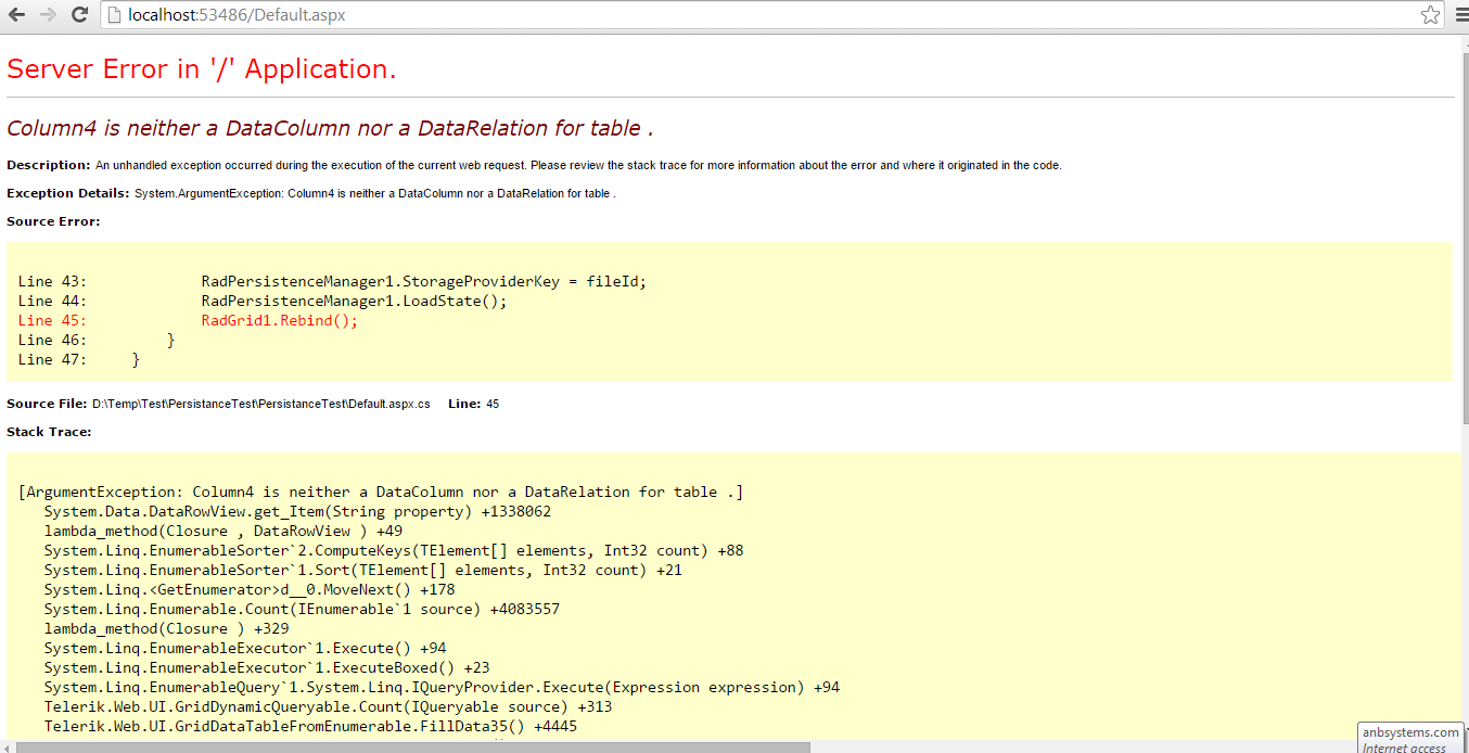 if i remove any static column from radgrid and datatable then load the already saved persistance values into radgrid its throwing error like
