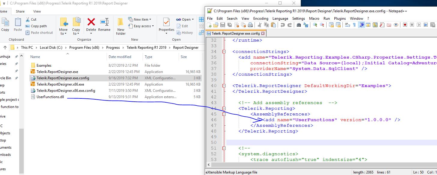 The idea is that the reporting engine uses reflection to load types from external assembly, where assemblies must be listed in a declared Telerik.Reporting section to be recognizable.