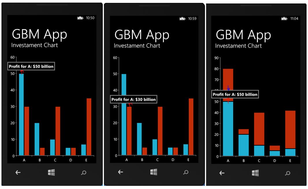However after changing CombineMode="Stack", I can see only one tool tip ($50 B i.e the first from bottom) in both the bar series. I should be able to see two different tool tips (similar to Cluster mode) based on their data in category A.