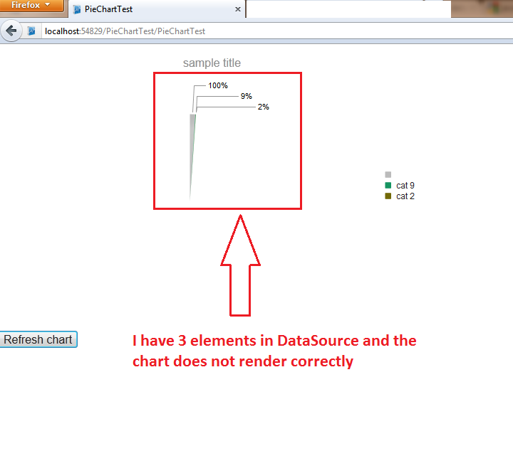 var newDataSource = new kendo.data.DataSource({ data: GLOBAL_ALL_PIE_DATA[controlID] }); var chartConfiguration = { theme: $(control).attr("theme"), title: { text: $(control).attr("title") }, legend: { position: $(control).attr("position") }, seriesDefaults: { labels: { visible: $(control).attr("showLabels"), format: "{0}%" } }, dataSource: newDataSource, series: [{ type: "pie", categoryField: "category", field: "value", colorField: "color" }], tooltip: { visible: $(control).attr("showTooltip"), format: "{0}%" } }; //create the chart $(jqControlID).kendoChart(chartConfiguration); } }}First time the Chart is rendered correctly.