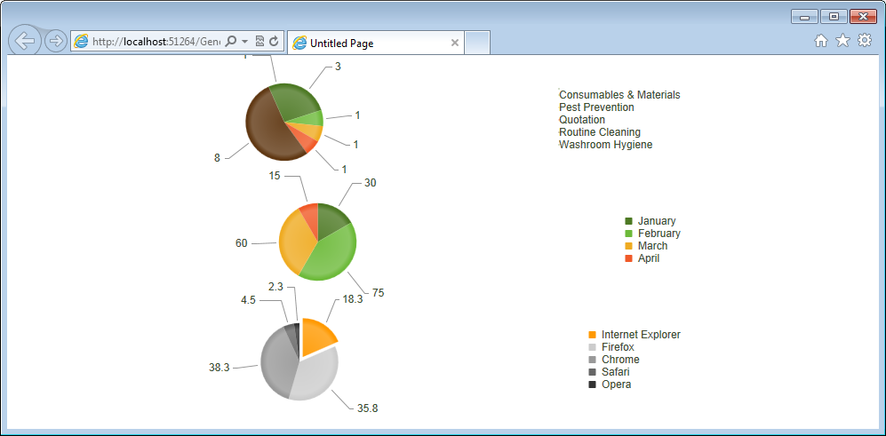 <telerik:RadHtmlChart runat="server" ID="RadHtmlChart2" Width="765px" Height="135px" Transitions="true" Skin="Forest" DataSourceID="SqlDataSource1" > <PlotArea > <Series> <telerik:PieSeries DataFieldY="TaskCount" NameField="TaskType" ></telerik:PieSeries> </Series> </PlotArea></telerik:RadHtmlChart> <telerik:RadHtmlChart runat="server" ID="RadHtmlChart1" Width="765px" Height="135px" Transitions="true" Skin="Forest" > <PlotArea > <Series> <telerik:PieSeries > <Items> <telerik:SeriesItem BackgroundColor="#ff9900" Exploded="true" Name="Internet Explorer" YValue="18.3"></telerik:SeriesItem> <telerik:SeriesItem BackgroundColor="#cccccc" Exploded="false" Name="Firefox" YValue="35.8"></telerik:SeriesItem> <telerik:SeriesItem BackgroundColor="#999999" Exploded="false" Name="Chrome" YValue="38.3"></telerik:SeriesItem> <telerik:SeriesItem BackgroundColor="#666666" Exploded="false" Name="Safari" YValue="4.5"></telerik:SeriesItem> <telerik:SeriesItem BackgroundColor="#333333" Exploded="false" Name="Opera" YValue="2.3"></telerik:SeriesItem> </Items> </telerik:PieSeries> </Series> </PlotArea></telerik:RadHtmlChart>11 Answers, 1 is accepted