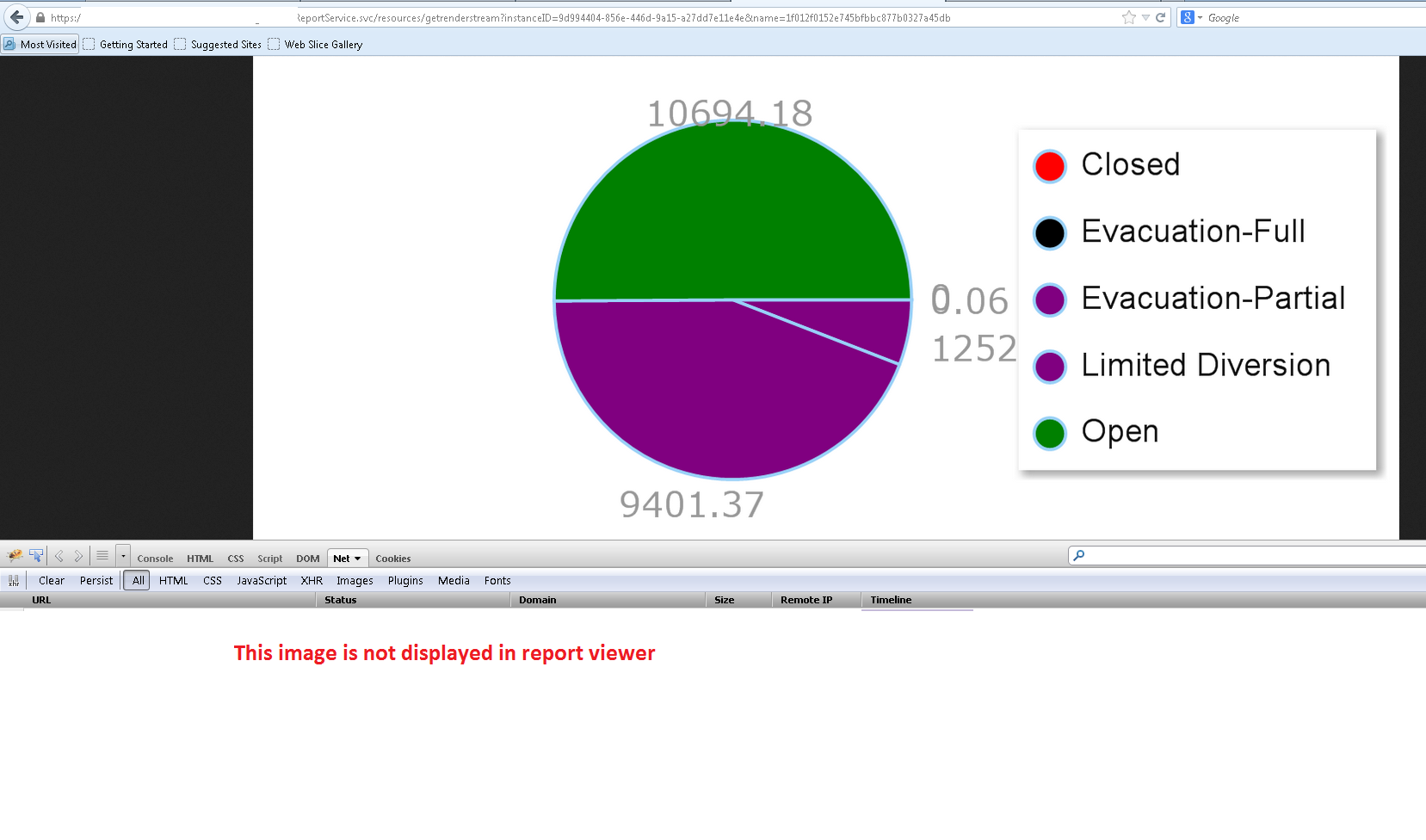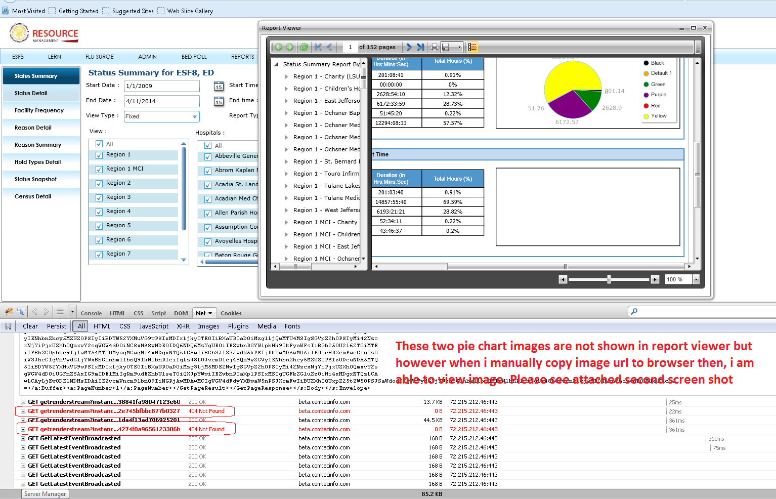 Please refer to attached screenshots (Report1.png & Report2.png). In the first screen shot, if we observe, two pie chart images are not displayed in report viewer but however, when i manually copy these images urls and paste in browser then, i am able to see images. So, can you please help us in resolving this?