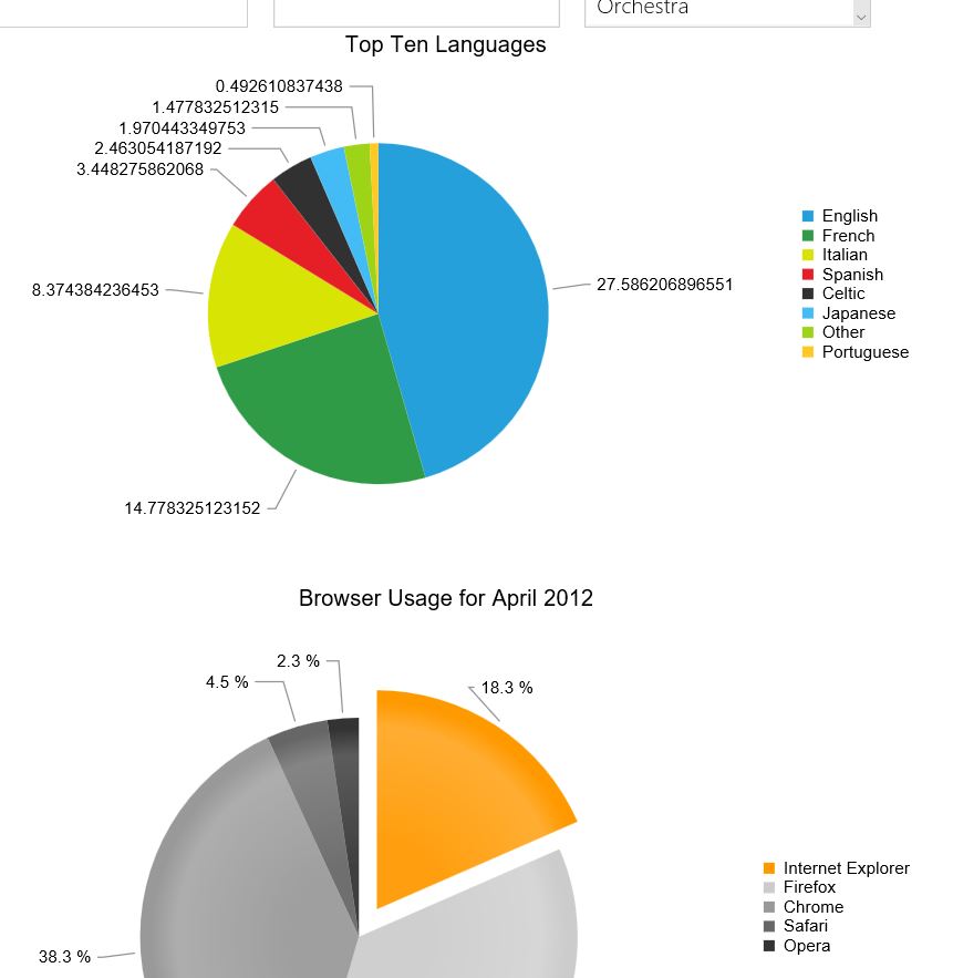 <telerik:RadHtmlChart runat="server" ID="RadHtmlChart1" DataSourceID="Language_Chart_Data"> <PlotArea> <Series> <telerik:PieSeries StartAngle="90" DataFieldY="count" NameField="language"> <SeriesItems > <telerik:PieSeriesItem BackgroundColor="#666666" Exploded="false" Name="Safari" Y="4.5"></telerik:PieSeriesItem> <telerik:PieSeriesItem BackgroundColor="#333333" Exploded="false" Name="Opera" Y="2.3"></telerik:PieSeriesItem> </SeriesItems> <LabelsAppearance Position="OutsideEnd" DataFormatString="{0} %" /> <TooltipsAppearance DataFormatString="{0} %" /> </telerik:PieSeries> </Series> </PlotArea> <ChartTitle Text="Top Five Languages"> </ChartTitle></telerik:RadHtmlChart>