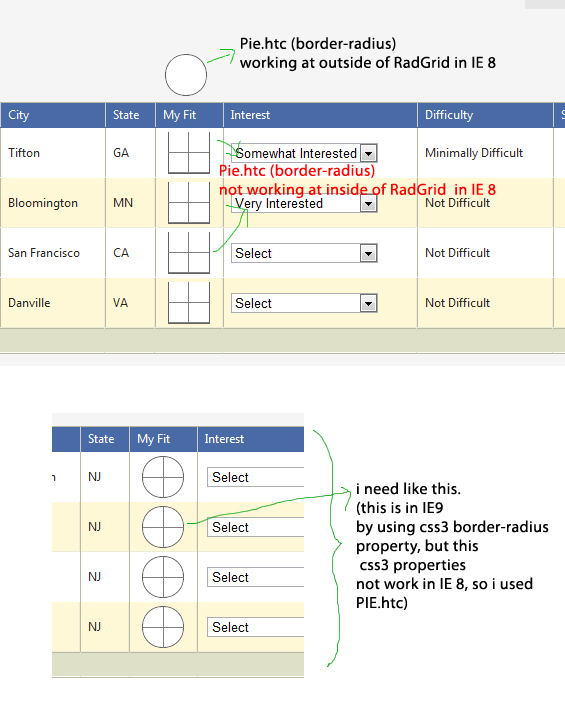 not working inside of Telerik RadGrid in IE8.(its working perfectly outside of radgrid)