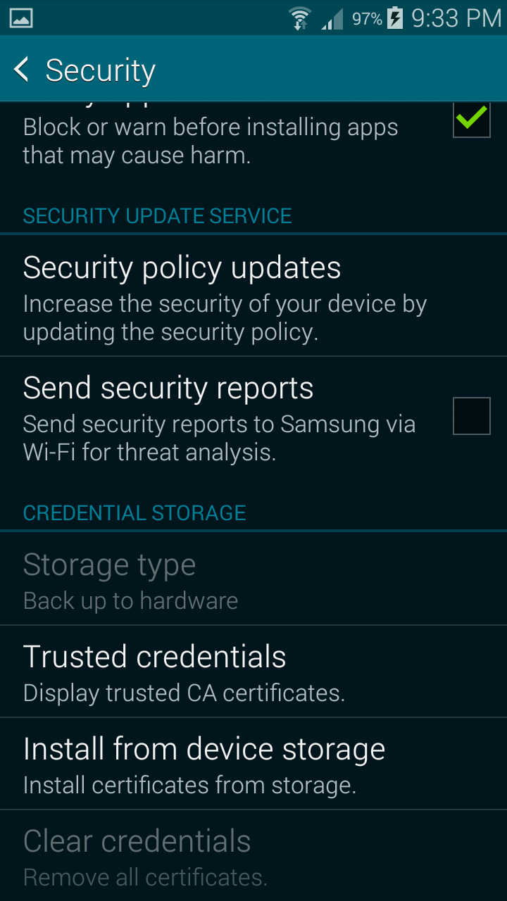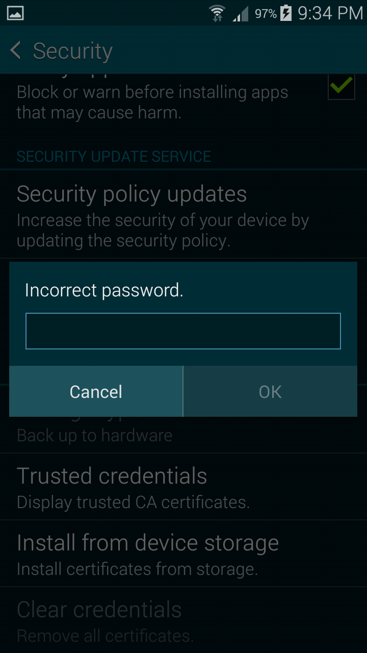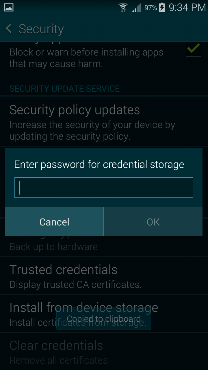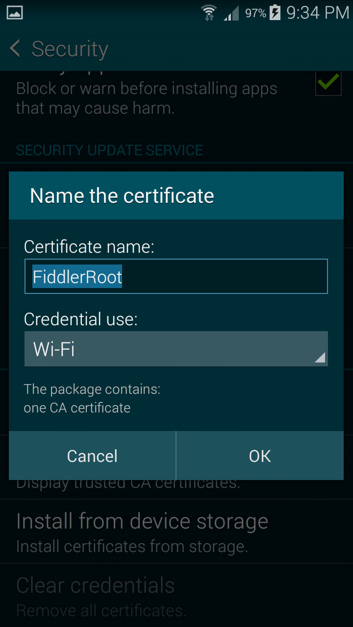 Hi. thanks for answering again. I think too that it's something related to my phone. I am having similar issues also trying to select a pin for my credit cards with my bank app, the bank which I work for and that gave me this galaxy s5. A friend of mine has issues installing fiddler cer on his s6 too. also his s6 is a business phone. I attach the screenshots that show in a sequence the selecion of pin for lock screen and then the issue installing the cer. The same process works just fine on my other phone which is a galaxy note2, an older model. I just would like to ask you also if this ever happened to other people and what they did to resolve it.