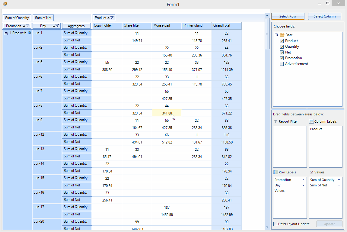What this code does is the following. When the double click event occurs, according to the mouse location, we get the pivot cell element clicked. Then we build the string with the needed information and we use a message box to display it.