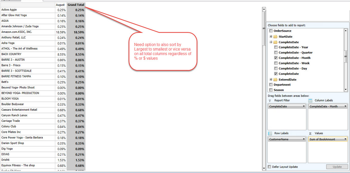 1. Ability to sort aggregate columns doesn't work.In the calculation If you choose highest to lowest A.) it doesn't work B.) it won't allow us to keep the number format you desire. In the example below I want to keep % and rank highest to lowest. Please see the attached image (image1.png).