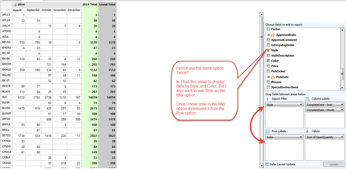 2. Cannot use the same field twice (i.e, we cannot add a column in both Row Labels and Report Filter) This is extremely limiting. Please see the below image (image2.png).