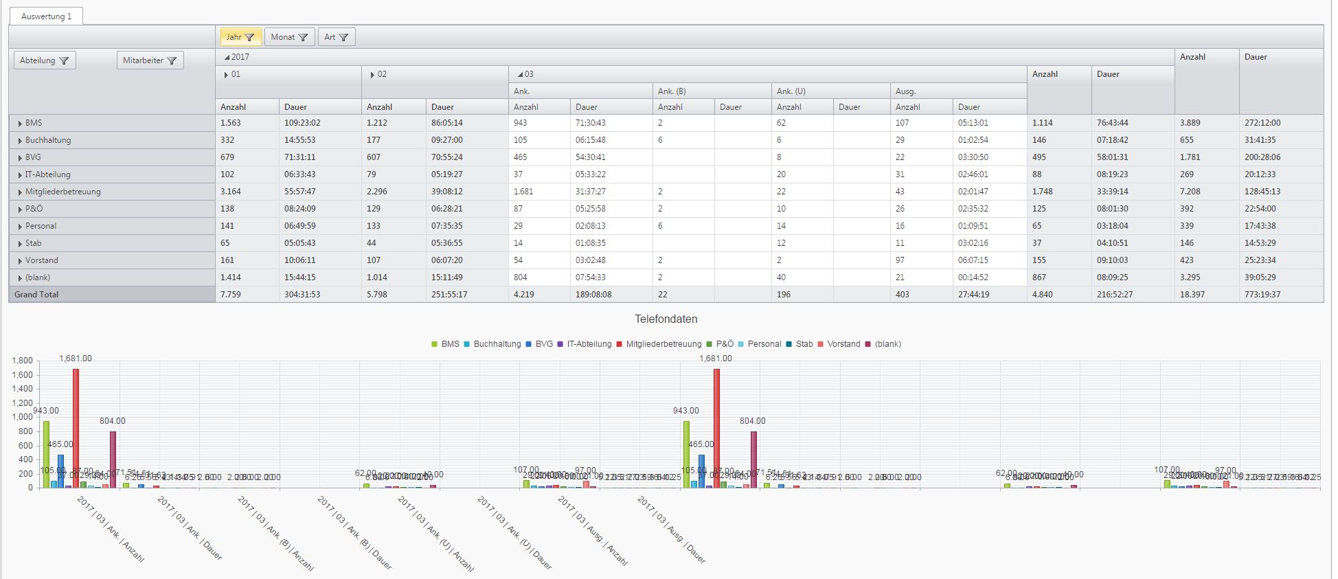 <%@ Page Title="" Language="C#" MasterPageFile="~/MasterPage/BdVNet.Master" AutoEventWireup="true" CodeBehind="Telefondaten.aspx.cs" Inherits="BdVNet.Content.Reporting.Telefondaten" %><asp:Content ID="ReportTelefonContent" ContentPlaceHolderID="BdVMasterContentPlaceHolder" runat="server"> <telerik:RadAjaxManagerProxy ID="ReportTelefonAjaxManagerProxy" runat="server"> <AjaxSettings> <telerik:AjaxSetting AjaxControlID="ReportTelefonPivotGrid"> <UpdatedControls> <telerik:AjaxUpdatedControl ControlID="ReportTelefonPivotGrid" /> <telerik:AjaxUpdatedControl ControlID="A1HtmlChart" /> </UpdatedControls> </telerik:AjaxSetting> <telerik:AjaxSetting AjaxControlID="ReportTelefonZeitenPivotGrid"> <UpdatedControls> <telerik:AjaxUpdatedControl ControlID="ReportTelefonZeitenPivotGrid" /> <telerik:AjaxUpdatedControl ControlID="A2HtmlChart" /> </UpdatedControls> </telerik:AjaxSetting> </AjaxSettings> </telerik:RadAjaxManagerProxy> <div class="box"> <telerik:RadTabStrip ID="ReportTelefonTabStrip" runat="server" MultiPageID="ReportTelefonMultiPage" SelectedIndex="0" Enabled="true" RenderMode="<%$ Resources:Einstellungen, RenderMode %>"> <Tabs> <telerik:RadTab runat="server" Text="Auswertung 1" Selected="true" /> <telerik:RadTab runat="server" Text="Auswertung 2" /> </Tabs> </telerik:RadTabStrip> <telerik:RadMultiPage ID="ReportTelefonMultiPage" runat="server" SelectedIndex="0" Enabled="true" RenderMode="<%$ Resources:Einstellungen, RenderMode %>"> <telerik:RadPageView ID="ReportTelefonA1PageView" runat="server"> <telerik:RadPivotGrid ID="ReportTelefonPivotGrid" runat="server" OnNeedDataSource="ReportTelefonPivotGrid_NeedDataSource" ShowDataHeaderZone="false" ShowFilterHeaderZone="false" TotalsSettings-ColumnGrandTotalsPosition="None" Culture="de-DE" RenderMode="<%$ Resources:Einstellungen, RenderMode %>" ColumnGroupsDefaultExpanded="false" OnCellDataBound="ReportTelefonPivotGrid_CellDataBound" EnableConfigurationPanel="false"> <Fields> <telerik:PivotGridRowField DataField="MitarbeiterDIMENSION_LONG" Caption="Abteilung" CellStyle-Width="150" ZoneIndex="0" /> <telerik:PivotGridRowField DataField="Name" Caption="Mitarbeiter" CellStyle-Width="150" /> <telerik:PivotGridColumnField DataField="Jahr" Caption="Jahr" /> <telerik:PivotGridColumnField DataField="Monat" Caption="Monat" /> <telerik:PivotGridColumnField DataField="Art" Caption="Art" /> <telerik:PivotGridAggregateField DataField="Dauer" DataFormatString="{0:N0}" Aggregate="Count"> <HeaderCellTemplate> Anzahl </HeaderCellTemplate> </telerik:PivotGridAggregateField> <telerik:PivotGridAggregateField DataField="DauerSek" DataFormatString="{0:N0}"> <HeaderCellTemplate> Dauer </HeaderCellTemplate> <CellTemplate> <%# (Convert.ToInt64(Container.DataItem) == 0) ? "" : string.Format("{0:d2}:{1:d2}:{2:d2}", (Convert.ToInt64(Container.DataItem)/3600) , (Convert.ToInt64(Container.DataItem)%3600)/60 , (Convert.ToInt64(Container.DataItem)%3600)%60) %> </CellTemplate> <RowTotalCellTemplate> <%# (Convert.ToInt64(Container.DataItem) == 0) ? "" : string.Format("{0:d2}:{1:d2}:{2:d2}", (Convert.ToInt64(Container.DataItem)/3600) , (Convert.ToInt64(Container.DataItem)%3600)/60 , (Convert.ToInt64(Container.DataItem)%3600)%60) %> </RowTotalCellTemplate> <RowGrandTotalCellTemplate> <%# (Convert.ToInt64(Container.DataItem) == 0) ? "" : string.Format("{0:d2}:{1:d2}:{2:d2}", (Convert.ToInt64(Container.DataItem)/3600) , (Convert.ToInt64(Container.DataItem)%3600)/60 , (Convert.ToInt64(Container.DataItem)%3600)%60) %> </RowGrandTotalCellTemplate> <ColumnTotalCellTemplate> <%# (Convert.ToInt64(Container.DataItem) == 0) ? "" : string.Format("{0:d2}:{1:d2}:{2:d2}", (Convert.ToInt64(Container.DataItem)/3600) , (Convert.ToInt64(Container.DataItem)%3600)/60 , (Convert.ToInt64(Container.DataItem)%3600)%60) %> </ColumnTotalCellTemplate> <ColumnGrandTotalCellTemplate> <%# (Convert.ToInt64(Container.DataItem) == 0) ? "" : string.Format("{0:d2}:{1:d2}:{2:d2}", (Convert.ToInt64(Container.DataItem)/3600) , (Convert.ToInt64(Container.DataItem)%3600)/60 , (Convert.ToInt64(Container.DataItem)%3600)%60) %> </ColumnGrandTotalCellTemplate> </telerik:PivotGridAggregateField> </Fields> <ConfigurationPanelSettings Position="Left" DefaultDeferedLayoutUpdate="true" /> </telerik:RadPivotGrid> <telerik:RadHtmlChart ID="A1HtmlChart" runat="server" RenderMode="<%$ Resources:Einstellungen, RenderMode %>" Legend-Appearance-Position="Top" PlotArea-YAxis-LabelsAppearance-DataFormatString="N0" PlotArea-XAxis-LabelsAppearance-RotationAngle="45"> <Appearance> <FillStyle BackgroundColor="Transparent" /> </Appearance> <ChartTitle Text="Telefondaten"> <Appearance Align="Center" BackgroundColor="Transparent" Position="Top" /> </ChartTitle> </telerik:RadHtmlChart> </telerik:RadPageView> <telerik:RadPageView ID="ReportTelefonA2PageView" runat="server"> <telerik:RadPivotGrid ID="ReportTelefonZeitenPivotGrid" runat="server" OnNeedDataSource="ReportTelefonZeitenPivotGrid_NeedDataSource" ShowDataHeaderZone="false" ShowFilterHeaderZone="false" TotalsSettings-ColumnGrandTotalsPosition="None" Culture="de-DE" RenderMode="<%$ Resources:Einstellungen, RenderMode %>" ColumnGroupsDefaultExpanded="false" OnCellDataBound="ReportTelefonZeitenPivotGrid_CellDataBound" EnableConfigurationPanel="false"> <Fields> <telerik:PivotGridRowField DataField="Wochentag" Caption="Wochentag" CellStyle-Width="100" /> <telerik:PivotGridRowField DataField="Stunde" Caption="Stunde" CellStyle-Width="100" ZoneIndex="0" /> <telerik:PivotGridRowField DataField="BN_Telefon_Nebenstelle_1" Caption="Nebenstelle" CellStyle-Width="150" ZoneIndex="0" /> <telerik:PivotGridColumnField DataField="Jahr" Caption="Jahr" /> <telerik:PivotGridColumnField DataField="Monat" Caption="Monat" /> <telerik:PivotGridColumnField DataField="Art" Caption="Art" /> <telerik:PivotGridAggregateField DataField="Dauer" DataFormatString="{0:N0}" Aggregate="Count"> <HeaderCellTemplate> Anzahl </HeaderCellTemplate> </telerik:PivotGridAggregateField> <telerik:PivotGridAggregateField DataField="DauerS