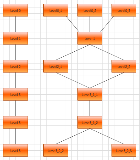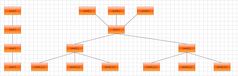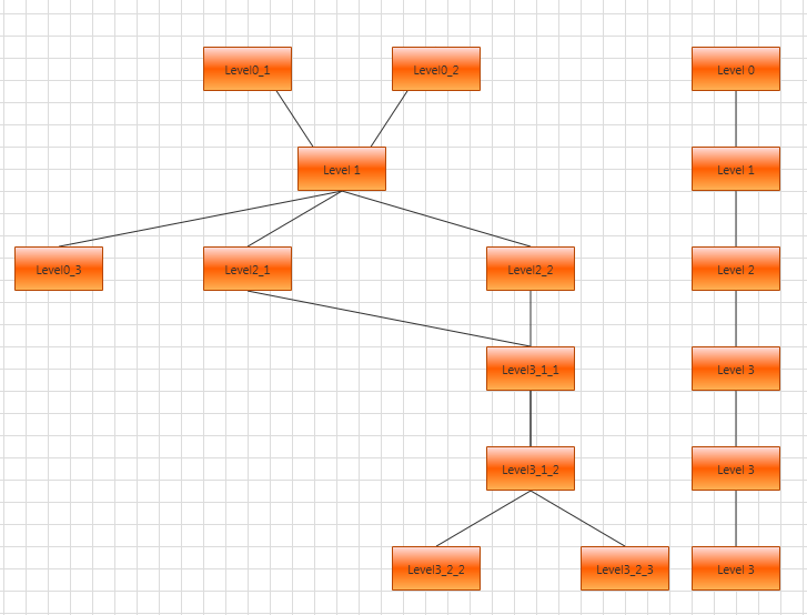 The other layout with misplaced shapes is produced because the tree layout in the diagram does not support cycles (level1 - level2_1 - level2_2 - level3_1_1 is a cycle). You can subscribe for DiagramLayoutComplete event and manually position the shapes by setting their Position property. Once a layout is ok for you, you can consider saving it and then loading it in future application runs. You can also consider writing your own Layout algorithm from scratch.