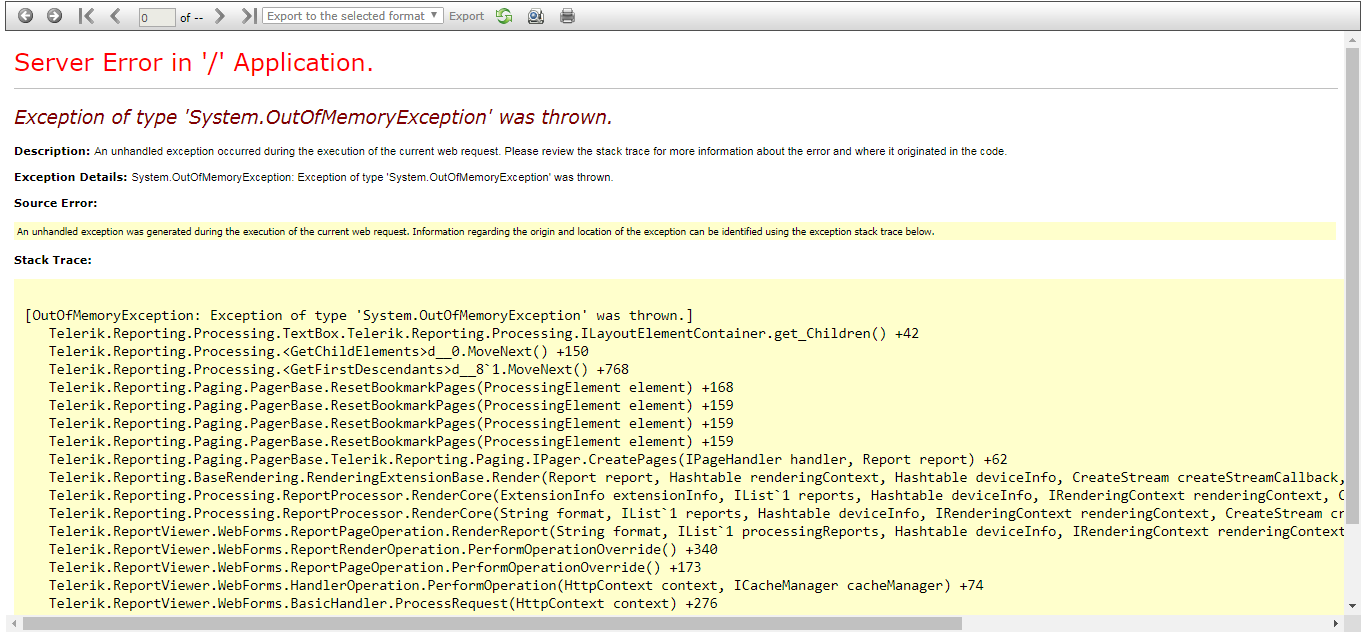 OutOfMemory exception usually indicates that the memory taken during the report generation has reached its limit.