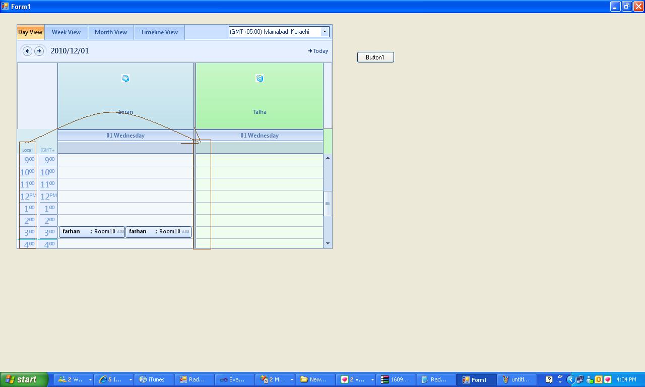 Imports Telerik.WinControls.UI Imports Telerik.WinControls.UI.Scheduler Imports Telerik.WinControls.UI.Scheduler.Dialogs   Public Class Form1           Private Sub Form1_Load(ByVal sender As System.Object, ByVal e As System.EventArgs) Handles MyBase.Load           Dim resourcesPerView As Integer = 2           Dim colors() As Color = {Color.LightBlue, Color.LightGreen, Color.LightYellow}         Dim names() As String = {"Alan Smith", "Anne Dodsworth", "Boyan Mastoni"}           For i As Integer = 0 To names.Length - 1             Dim resource As New Telerik.WinControls.UI.Resource()             resource.Id = New EventId(i)             resource.Name = names(i)             resource.Color = colors(i)               Me.RadScheduler1.Resources.Add(resource)               Dim view As SchedulerDayViewBase = TryCast(Me.RadScheduler1.ActiveView, SchedulerDayViewBase)             If view IsNot Nothing Then                Dim schedulerTimeZone As SchedulerTimeZone = Time.GetSchedulerTimeZones(i)                 If (Not view.TimeZones.Contains(schedulerTimeZone)) And i < resourcesPerView - 1 Then                    view.TimeZones.Add(schedulerTimeZone)                 End If            End If        Next i           Me.RadScheduler1.GroupType = GroupType.Resource         Me.RadScheduler1.GetDayView().ResourcesPerView = resourcesPerView       End Sub  End ClassHope this helps but let me know if you need more information