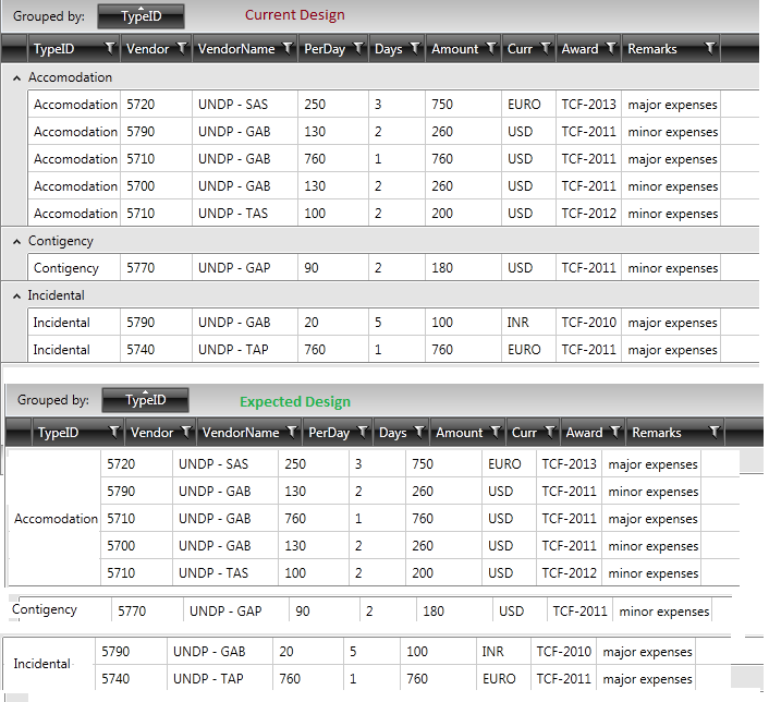 I want to modify the default design of GroupItem in RedGridView control. Please have a look at image attach to understand exact requirement.