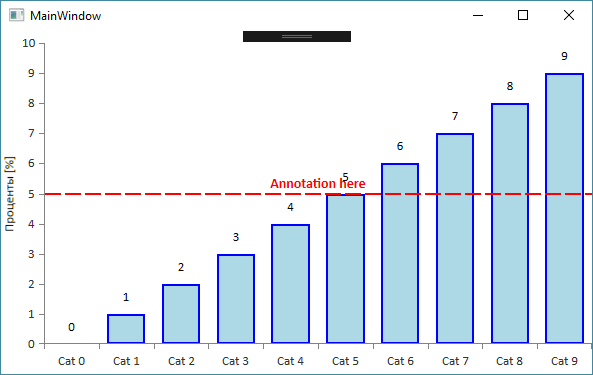 <telerik:RadCartesianChart Visibility="{Binding IsAbsoluteBarChartVisible}"> <!--Annotation line--> <telerik:RadCartesianChart.Annotations> <telerik:CartesianGridLineAnnotation Axis="{Binding ElementName=verticalAxis}" Value="{Binding AnnotationValue}" Label="{Binding AnnotationLabel}" Stroke="Red" StrokeThickness="2" DashArray="8 2"> <!--Annotation line definition--> <telerik:CartesianGridLineAnnotation.LabelDefinition> <telerik:ChartAnnotationLabelDefinition Location="Inside" VerticalAlignment="Bottom" HorizontalAlignment="Center"> <!--Установить стиль для аннотационной метки--> <telerik:ChartAnnotationLabelDefinition.DefaultVisualStyle> <Style TargetType="TextBlock"> <Setter Property="FontSize" Value="14"/> <Setter Property="FontWeight" Value="DemiBold"/> <Setter Property="Foreground" Value="Red" /> </Style> </telerik:ChartAnnotationLabelDefinition.DefaultVisualStyle> </telerik:ChartAnnotationLabelDefinition> </telerik:CartesianGridLineAnnotation.LabelDefinition> </telerik:CartesianGridLineAnnotation> </telerik:RadCartesianChart.Annotations> <!-- X-axis --> <telerik:RadCartesianChart.HorizontalAxis> <telerik:CategoricalAxis/> </telerik:RadCartesianChart.HorizontalAxis> <!-- Y-axis --> <telerik:RadCartesianChart.VerticalAxis> <telerik:LinearAxis x:Name="verticalAxis" Title="Проценты [%]" Minimum="{Binding ChartMinimum}" Maximum="{Binding ChartMaximum}" MajorStep="{Binding CurrentStep}"/> </telerik:RadCartesianChart.VerticalAxis> <!--Bar chart itself--> <telerik:RadCartesianChart.Series> <telerik:BarSeries ShowLabels="True" CategoryBinding="Category" ValueBinding="Value" ItemsSource="{Binding Data}"/> </telerik:RadCartesianChart.Series></telerik:RadCartesianChart>