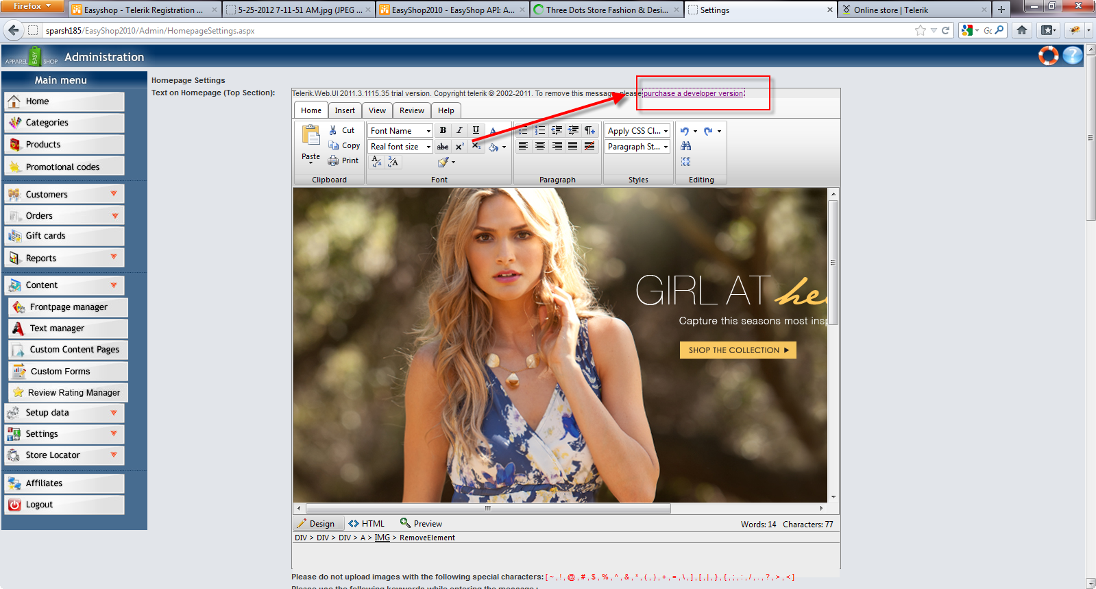 i am using telerik rad editor in my application i am using the Q3 version of telerik dll , initially i used the trail version of the dll after all the implementation is over i replaced withe the licensed version of the dll s( teleri.web.ui.dll & Telerik.Web.UI.xml) but still i am getting the message ,if you need more please see the image attached