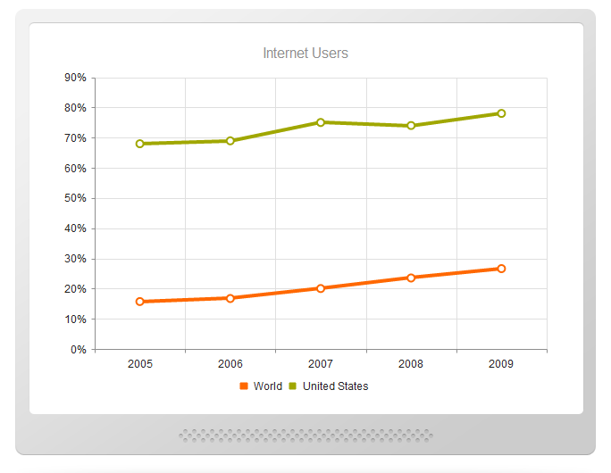 <!doctype html><html> <head> <title>Basic usage</title> <link href="../../shared/styles/examples.css" rel="stylesheet"/> <link href="../../shared/styles/examples-offline.css" rel="stylesheet"/> <link href="../../../source/styles/kendo.common.css" rel="stylesheet"/> <link href="../../../source/styles/kendo.default.css" rel="stylesheet"/> <script src="../../../source/js/jquery.min.js"></script> <script src="../../../source/js/kendo.core.js"></script> <script src="../../../source/js/kendo.data.js"></script> <script src="../../../source/js/kendo.chart.js"></script> </head> <body> <a href="../index.html">Back</a> <div class="description">Basic usage</div> <div id="example" class="k-content"> <div class="chart-wrapper"> <div id="chart");"></div> </div> <script> function createChart() { $("#chart").kendoChart({ theme: $(document).data("kendoSkin") || "default", title: { text: "Internet Users" }, legend: { position: "bottom" }, chartArea: { background: "" }, seriesDefaults: { type: "line" }, series: [{ name: "World", data: [15.7, 16.7, 20, 23.5, 26.6] }, { name: "United States", data: [67.96, 68.93, 75, 74, 78] }], valueAxis: { labels: { format: "{0}%" } }, categoryAxis: { categories: [2005, 2006, 2007, 2008, 2009], plotBands: [{ from: 2006, to: 2007, color: "#000", opacity: 0.2 }] }, tooltip: { visible: true, format: "{0}%" } }); } $(document).ready(function() { setTimeout(function() { createChart(); // Initialize the chart with a delay to make sure // the initial animation is visible }, 400); $(document).bind("kendo:skinChange", function(e) { createChart(); }); }); </script> </div> </body></html>