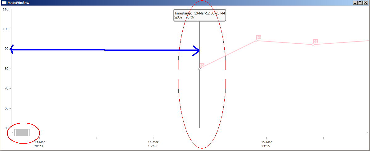 HH:mm" LabelFitMode="MultiLine" LabelInterval="2" PlotMode="OnTicksPadded"> <telerik:DateTimeContinuousAxis.PanZoomBarStyle> <Style TargetType="telerik:PanZoomBar"> <Setter Property="Height" Value="30" /> </Style> </telerik:DateTimeContinuousAxis.PanZoomBarStyle> </chartView:DateTimeContinuousAxis> </chart:RadCartesianChart.HorizontalAxis> <chart:RadCartesianChart.VerticalAxis> <chartView:LinearAxis Minimum="50" Maximum="110"/> </chart:RadCartesianChart.VerticalAxis> <chart:RadCartesianChart.Series> <chartView:LineSeries x:Name="LineSeries1" Stroke="Pink" StrokeThickness="2" ShowLabels="True" CategoryBinding="Timestamp" ValueBinding="SpO2" ItemsSource="{Binding ElementName=ChartDataSource1}" PointTemplate="{StaticResource PointTemplate}"> <chartView:LineSeries.LabelDefinitions> <telerik:ChartSeriesLabelDefinition Template="{StaticResource LabelTemplate}" Margin="20,0,0,0"> </telerik:ChartSeriesLabelDefinition> </chartView:LineSeries.LabelDefinitions> <chartView:LineSeries.TrackBallInfoTemplate > <DataTemplate> <StackPanel Orientation="Vertical"> <TextBlock> <Run Text="Timestamp: "/> <Run Text="{Binding DataPoint.Category, StringFormat=\{0:dd-MMM-yy hh:mm tt\}}"/> </TextBlock> <TextBlock> <Run Text="SpO2: "/> <Run Text="{Binding DataPoint.Value, StringFormat=\{0:N0\}}"/> <Run Text="%"/> </TextBlock> </StackPanel> </DataTemplate> </chartView:LineSeries.TrackBallInfoTemplate> </chartView:LineSeries> </chart:RadCartesianChart.Series> </chart:RadCartesianChart> </Grid></Window>MainViewMmodel.cs