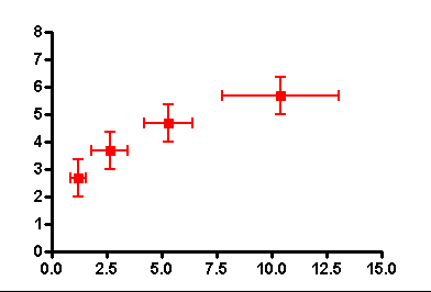 Each point has 4 numbers , the x coordinate(x), the y coordinate(y), the uncertainty on the x coordinate (ux) and the uncertainty on the y coordinate(uy). The result is a dot on (x,y), then a horizontal line centered in the dot (x,y) with a width of 2*(ux), and a vertical line centered in (x,y) with a height of 2*(uy)