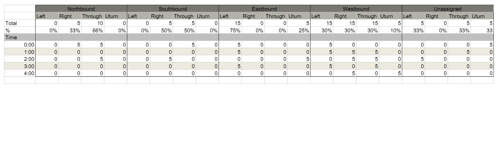 public class IntervalApproachModel{ public IntervalApproachModel() { Northbound = new ApproachCountModel(); Eastbound = new ApproachCountModel(); Southbound = new ApproachCountModel(); Westbound = new ApproachCountModel(); Unassigned = new ApproachCountModel(); } public DateTime Time { get; set; } public ApproachCountModel Northbound { get; set; } public ApproachCountModel Eastbound { get; set; } public ApproachCountModel Southbound { get; set; } public ApproachCountModel Westbound { get; set; } public ApproachCountModel Unassigned { get; set; }} public class ApproachCountModel { public ApproachTypes ApproachType { get; set; } public int Left { get; set; } public int Right { get; set; } public int UTurn { get; set; } public int Through { get; set; } public int Peds { get; set; } public int Total { get { return Left + Right + UTurn + Through + Peds; } } }When I create the report I call a setup method that takes a model with all the count data for the date. When the report calls the NeedDataSource event I parse the data into time slices and fill an IntervalApproachModel with all the counts during that time slice. I set the data source to a list of IntervalApproachModels.