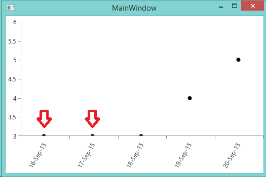 PointSeries.DataPoints.Add( new Telerik.Charting.CategoricalDataPoint() {Category = DateTime.Today.AddDays(i), Value = i%2 == 0 ? double.Epsilon : i/5.0});LineSeries.DataPoints.Add( new Telerik.Charting.CategoricalDataPoint() { Category = DateTime.Today.AddDays(i), Value = Math.Max(double.Epsilon,4.0-i/2.0) });Again, not something that should be necessary in production code.