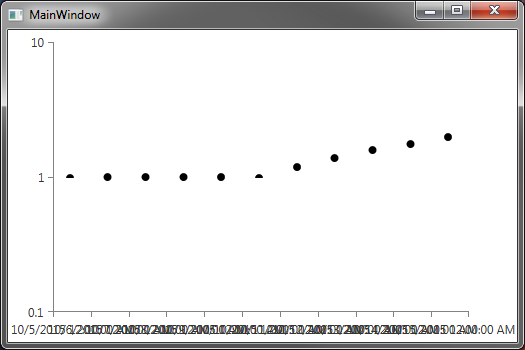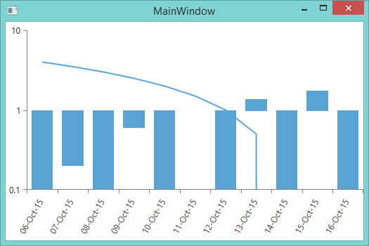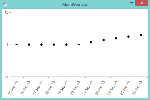 public MainWindow(){ InitializeComponent(); for (int i = 0; i < 11; i++) { PointSeries.DataPoints.Add( new Telerik.Charting.CategoricalDataPoint() {Category = DateTime.Today.AddDays(i), Value = i%2 == 0 ? 0 : i/5.0}); LineSeries.DataPoints.Add( new Telerik.Charting.CategoricalDataPoint() { Category = DateTime.Today.AddDays(i), Value = 4.0-i/2.0 }); }}Your original question was about a BarSeries with a point template not being plotted properly. If we have now resolved this, and you have a new question about how the logarithmic axis chooses to plot its items, you can open a new thread. I ask this because we prefer to keep issues separated, because it is easier to follow a conversation.