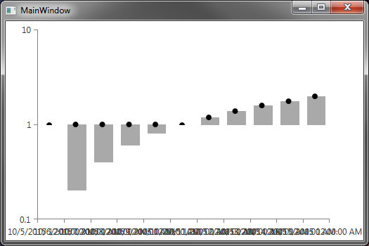 <Window x:Class="ZeroLogAxis.MainWindow" xmlns:telerik="http://schemas.telerik.com/2008/xaml/presentation" Title="MainWindow" Height="350" Width="525"> <Grid> <telerik:RadCartesianChart> <telerik:RadCartesianChart.Resources> <DataTemplate x:Key="PointTemplate"> <Ellipse Width="8" Height="8" VerticalAlignment="Top" Margin="-4,-4,0,0" Fill="Black" /> </DataTemplate> <Style TargetType="telerik:BarSeries"> <Setter Property="PointTemplate" Value="{StaticResource PointTemplate}" /> </Style> </telerik:RadCartesianChart.Resources> <telerik:RadCartesianChart.HorizontalAxis> <telerik:DateTimeContinuousAxis LabelFitMode="Rotate" LabelFormat="dd-MMM-yy" /> </telerik:RadCartesianChart.HorizontalAxis> <telerik:RadCartesianChart.VerticalAxis> <telerik:LinearAxis Minimum="3" Maximum="6" /> </telerik:RadCartesianChart.VerticalAxis> <telerik:RadCartesianChart.Series> <telerik:BarSeries Name="BarSeries" /> </telerik:RadCartesianChart.Series> </telerik:RadCartesianChart> </Grid></Window>Code Behind: