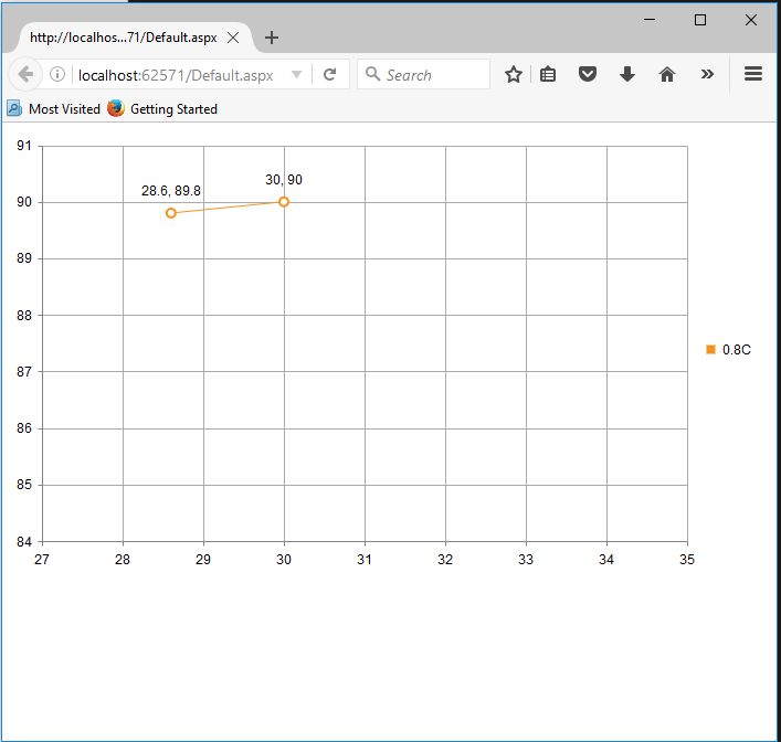 <telerik:RadHtmlChart runat="server" ID="ScatterLineChart1" Transitions="true"> <PlotArea> <Series> <telerik:ScatterLineSeries Name="0.8C" MissingValues="Gap"> <MarkersAppearance MarkersType="Circle" /> <SeriesItems> <telerik:ScatterSeriesItem X="28.6" Y="89.8" /> <telerik:ScatterSeriesItem X="30" Y="90" /> </SeriesItems> </telerik:ScatterLineSeries> </Series> <XAxis MinValue="27" MaxValue="35"> <MinorGridLines Visible="false" /> </XAxis> <YAxis MinValue="84" MaxValue="91"> <MinorGridLines Visible="false" /> </YAxis> </PlotArea></telerik:RadHtmlChart>And here is the result I get:
