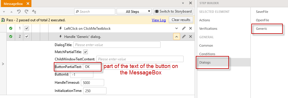 Please, refer to the attached screenshot for further reference. The "InitializationTime" property could be increase in order to give some time the message box to appear as well.