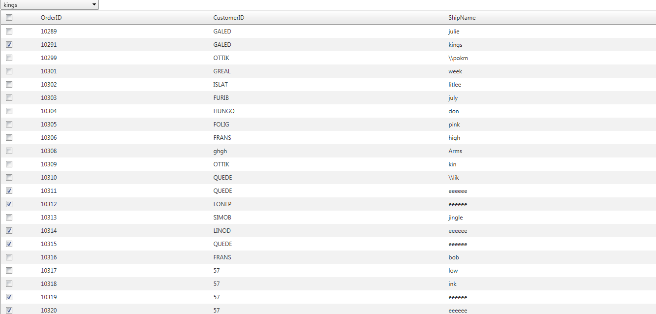 <telerik:RadDropDownList ID="MarketDropDownList" runat="server" DefaultMessage="--Select Market--" Width="200px" DataTextField="ShipName" DataValueField="ShipName" DataSourceID="ddlDataSource" AutoPostBack="true" OnSelectedIndexChanged="MarketDropDownList_SelectedIndexChanged"></telerik:RadDropDownList><asp:Panel ID="panel1" runat="server"> <telerik:RadGrid ID="radProductsGrid" runat="server" AllowPaging="true" AllowSorting="true" AutoGenerateColumns="false" GridLines="None" PageSize="100" ShowGroupPanel="false" Skin="Default" OnNeedDataSource="radProductsGrid_NeedDataSource"> <MasterTableView AllowCustomSorting="true" AllowMultiColumnSorting="false" AllowNaturalSort="false" AllowSorting="true" AutoGenerateColumns="false" Width="100%"> <Columns> <telerik:GridTemplateColumn AllowFiltering="true" HeaderText="OrderID" ReadOnly="true" UniqueName="OrderID1"> <HeaderTemplate> <asp:CheckBox ID="headerCheck" runat="server" /> </HeaderTemplate> <ItemTemplate> <asp:CheckBox ID="ProductInMarket" runat="server" /> <asp:HiddenField ID="ProductID" runat="server" Value="ProductID" /> </ItemTemplate> <ItemStyle VerticalAlign="Middle" Width="60px" /> </telerik:GridTemplateColumn> <telerik:GridBoundColumn AllowFiltering="true" DataField="OrderID" HeaderText="OrderID" ReadOnly="true" SortExpression="OrderID" UniqueName="OrderID"> </telerik:GridBoundColumn> <telerik:GridBoundColumn AllowFiltering="true" DataField="CustomerID" HeaderText="CustomerID" ReadOnly="true" SortExpression="CustomerID" UniqueName="CustomerID"> </telerik:GridBoundColumn> <telerik:GridBoundColumn AllowFiltering="true" DataField="ShipName" HeaderText="ShipName" ReadOnly="true" SortExpression="ShipName" UniqueName="ShipName"> </telerik:GridBoundColumn> </Columns> </MasterTableView> </telerik:RadGrid></asp:Panel><asp:SqlDataSource ID="ddlDataSource" runat="server" ConnectionString="<%$ ConnectionStrings:NorthwindConnectionString %>" SelectCommand="SELECT [OrderID], [CustomerID], [ShipName], [IsTrue] FROM [Orders]"></asp:SqlDataSource>C#: