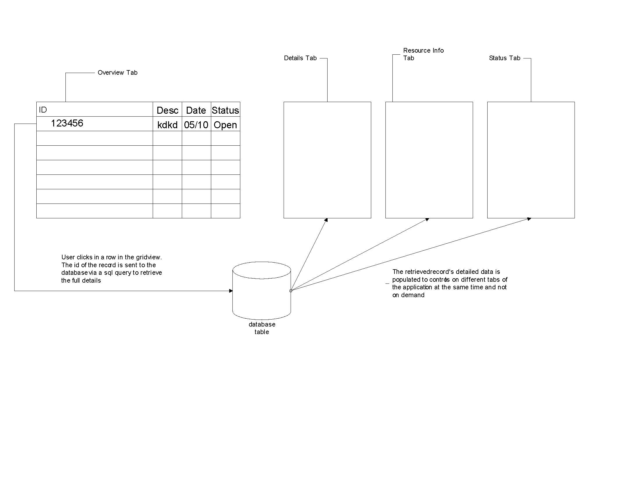 Pls note: I want the selected records information to be populated in all the four tabs at the same time(NOT ON DEMAND!!!) so that I can click on each tab and display the data for that ticket(eg I click on the ticket details tab to view the details or click the status tab to see the status of the ticket)