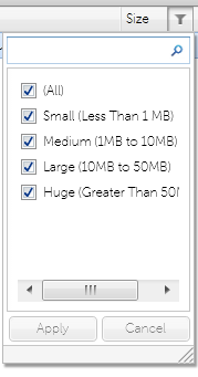Data source for this column is a Size property, which comes in bytes, and might be from 0 bytes to several megabytes. I would like to define the filters as in the attached screen, but I did not find a way to do this.