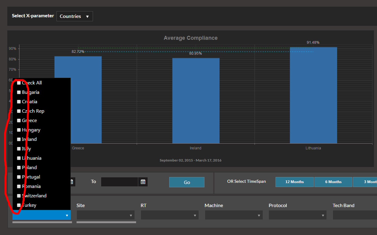 <telerik:RadDropDownList ID="RadDropDownParameterX" runat="server" DropDownHeight="120px" Width="120px" Skin="BlackMetroTouch" DropDownWidth="120px" OnSelectedIndexChanged="RadDropDownParameterX_SelectedIndexChanged" AutoPostBack="true" > <Items> <telerik:DropDownListItem Text="Countries" Value="Countries" Selected="true" /> <telerik:DropDownListItem Text="Sites" Value="Sites" /> <telerik:DropDownListItem Text="Rts" Value="Rts" /> <telerik:DropDownListItem Text="Machines" Value="Machines" /> <telerik:DropDownListItem Text="Protocols" Value="Protocols" /> </Items> </telerik:RadDropDownList>With the following code/logic: