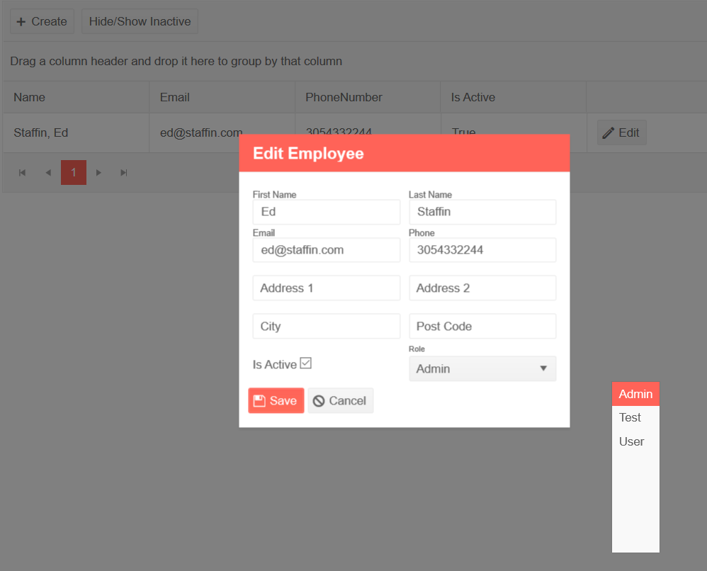 <TelerikWindow Visible="@(selectedUser != null)" Modal="true"> <WindowTitle> @{ if (selectedUser.Id < 0) { <strong>Add Employee</strong> } else { <strong>Edit Employee</strong> } } </WindowTitle> <WindowContent> <EditForm Model="@selectedUser" OnValidSubmit="@Save"> <DataAnnotationsValidator /> <div class="form-row"> <div class="col"> <TelerikTextBox @bind-Value="@selectedUser.FirstName" Label="First Name"></TelerikTextBox> </div> <div class="col"> <TelerikTextBox @bind-Value="@selectedUser.LastName" Label="Last Name"></TelerikTextBox> </div> </div> @*<div class="form-row"> <div class="col"> <TelerikDropDownList Data="@lstRoles" @bind-Value=@SelectedRole PopupHeight="170px" ValueField="Id" TextField="RoleName"> </TelerikDropDownList> </div> </div>*@ <div class="form-row"> <div class="col"> <TelerikTextBox @bind-Value="@selectedUser.Email" Label="Email"></TelerikTextBox> </div> <div class="col" > <TelerikTextBox @bind-Value="@selectedUser.PhoneNumber" Label="Phone"></TelerikTextBox> </div> </div> <div class="form-row"> <div class="col"> <TelerikTextBox @bind-Value="@selectedUser.Address1" Label="Address 1"></TelerikTextBox> </div> <div class="col"> <TelerikTextBox @bind-Value="@selectedUser.Address2" Label="Address 2"></TelerikTextBox> </div> </div> <div class="form-row"> <div class="col"> <TelerikTextBox @bind-Value="@selectedUser.City" Label="City"></TelerikTextBox> </div> <div class="col"> <TelerikTextBox @bind-Value="@selectedUser.PostCode" Label="Post Code"></TelerikTextBox> </div> </div> <div class="form-row"> <div class="col"> <div style="margin-top:20px;"> Is Active <InputCheckbox @bind-Value="@selectedUser.IsActive" /> </div> </div> <div class="col"> <span class="k-label" style="font-size:7pt">Role</span> <TelerikDropDownList Data="@lstRoles" TextField="Name" ValueField="Id" @bind-Value="selectedRole" Width="100"> </TelerikDropDownList> </div> </div> <div class="form-row"> <br /> <ValidationSummary /> <TelerikButton Class="mt-2" Icon="save" Primary="true" ButtonType="@ButtonType.Submit">Save</TelerikButton> <TelerikButton Class="mt-2" Icon="cancel" OnClick="@ClearSelection" ButtonType="@ButtonType.Button">Cancel</TelerikButton> </div> </EditForm> </WindowContent></TelerikWindow>