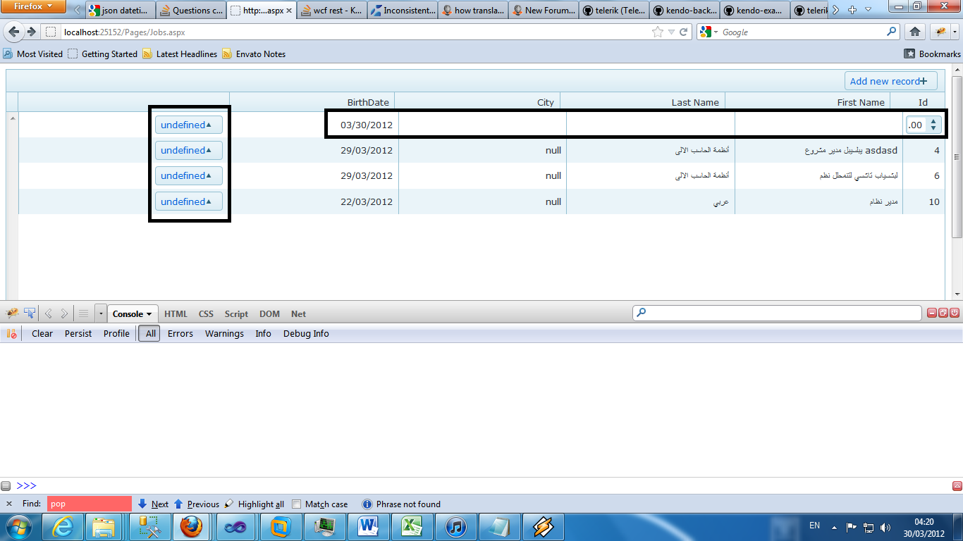 $(document).ready(function () { $("#mygrid").kendoGrid({ dataSource: { schema: { data: 'd', model: { id: "Id", fields: { Id: { type: "number" }, FirstName: { type: "string" }, LastName: { type: "string" }, City: { type: "string" }, BirthDate: { type: "date" } } } }, transport: { create: { url: "../Webservices/KendoService.asmx/CreateAds", //specify the URL which should create new records. This is the Create method of the Products.asmx service. contentType: "application/json; charset=utf-8", // tells the web service to serialize JSON type: "POST" //use HTTP POST request as the default GET is not allowed for ASMX }, read: { url: "../Webservices/KendoService.asmx/ReadAds", //specify the URL which data should return the records. This is the Read method of the Products.asmx service. contentType: "application/json; charset=utf-8", // tells the web service to serialize JSON type: "POST" //use HTTP POST request as the default GET is not allowed for ASMX }, update: { url: "../Webservices/KendoService.asmx/UpdateAds", //specify the URL from which should update the records. This is the Update method of the Products.asmx service. contentType: "application/json; charset=utf-8", // tells the web service to serialize JSON type: "POST" //use HTTP POST request as the default GET is not allowed for ASMX }, destroy: { url: "../Webservices/KendoService.asmx/DestroyAds", //specify the URL which should destroy records. This is the Destroy method of the Products.asmx service. contentType: "application/json; charset=utf-8", // tells the web service to serialize JSON type: "POST" //use HTTP POST request as the default GET is not allowed for ASMX }, parameterMap: function (data, operation) { if (operation != "read") { // web service method parameters need to be send as JSON. The Create, Update and Destroy methods have a "products" parameter. return JSON.stringify({ products: data.models }) } } }, pageSize: 10 }, pageable: true, height: 400, toolbar: ["create"], columns: [ { field: "Id", width: "60px" }, { field: "FirstName", title: "First Name" }, { field: "LastName", title: "Last Name" }, { field: "City" }, { field: "BirthDate", template: '#= kendo.toString(BirthDate,"MM/dd/yyyy") #' }, { command: [ { name: "edit", text: "CustomEdit" }, // sets the text of the Edit button {name: "destroy", text: "Destroy"} // sets the text of the "Delete" button ], // sets the title and the width of the commands column title: " ", width: "300px" } ], editable: "popup", //changes the text of the "Update" and "Cancel" buttons in the inline edit mode edit: function () { var updateBtnTxt = "CustomUpdate", cancelBtnTxt = "CustomCancel", curr_container = this._editContainer; //selects the current edit container //sets the text of the "Update" button $(curr_container).find("a.k-grid-update").text(updateBtnTxt); //sets the text of the "Cancel" button $(curr_container).find("a.k-grid-cancel").text(cancelBtnTxt); } });});web service code