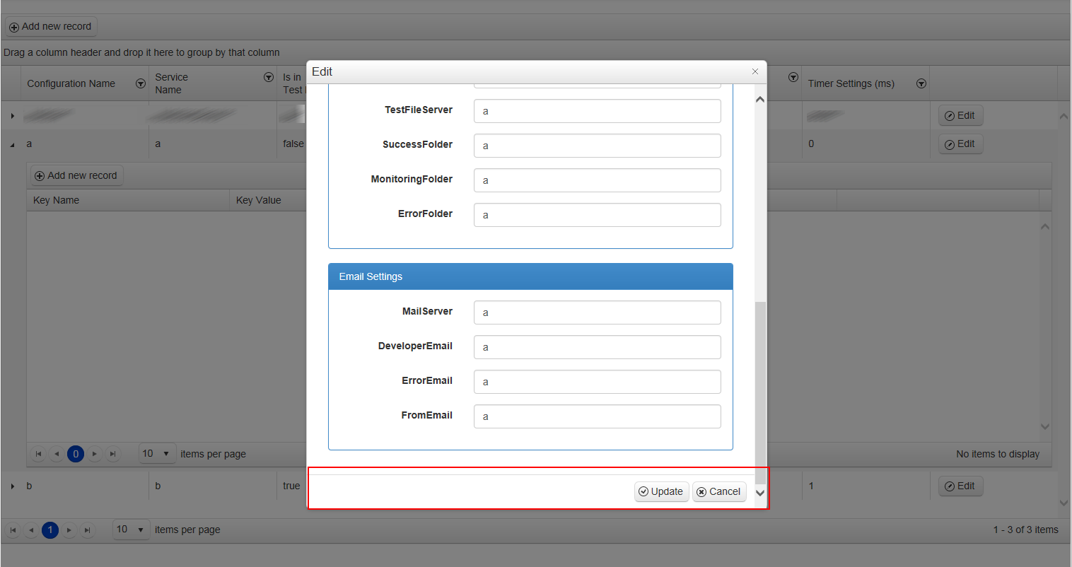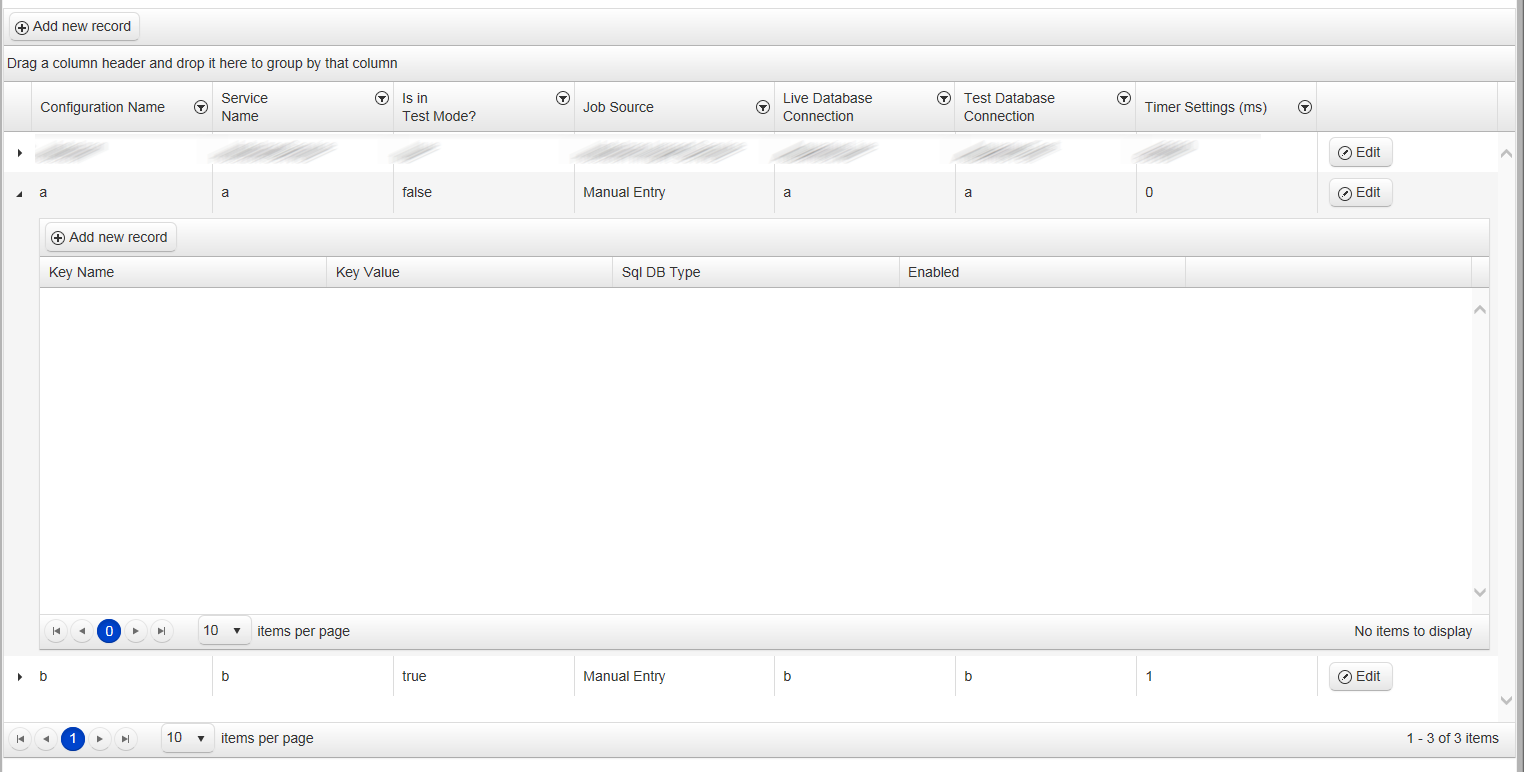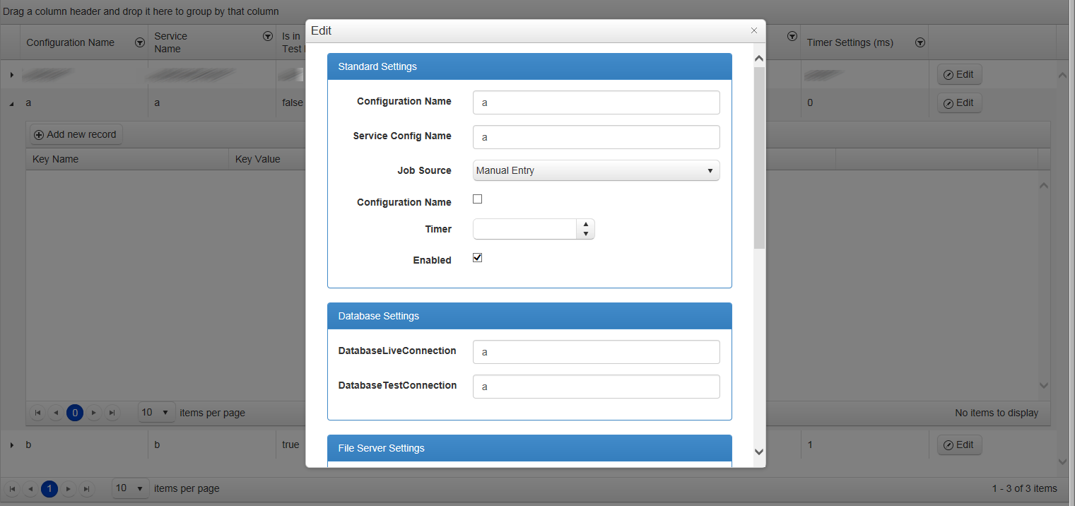 Index.cshtml @(Html.Kendo().Grid<Project.ViewModels.ConfigurationSetting>() .Name("Grid") .Columns(columns => { columns.Bound(a => a.Name); columns.Bound(a => a.ServiceName).Title("Service<br/>Name"); columns.Bound(a => a.TestMode).Title("Is in<br/>Test Mode?"); columns.Bound(a => a.JobSourceItem).Title("Job Source").ClientTemplate("#=JobSourceItem.JobSourceName#").Width(200); columns.Bound(a => a.DatabaseLiveConnection).Title("Live Database<br/>Connection"); columns.Bound(a => a.DatabaseTestConnection).Title("Test Database<br/>Connection"); columns.Bound(a => a.Timer).Title("Timer Settings (ms)"); columns.Command(command => command.Edit()); }) .Editable(edit => edit.Mode(GridEditMode.PopUp) .Window(window => window.Animation(true) .Scrollable(true) .Resizable(resize => resize.Enabled(true)) .Width(650) .Height(600) ) .TemplateName("ConfigurationSettingEditor") ) .Pageable() .Pageable(c => c.PageSizes(new int[] { 10, 20, 50, 100 })) .Sortable() .HtmlAttributes(new { style = "height:600px;" }) .Events(events => events.DataBound("onDataBound")) .Scrollable() .Resizable(c => c.Columns(true)) .ClientDetailTemplateId("template") .Events(e => e.Edit("onEdit")) .ToolBar(toolBar => { toolBar.Create(); }) .DataSource(dataSource => dataSource .Ajax() .Read(read => read.Action("ConfigurationSetting_Read", "Home")) .Update(update => update.Action("ConfigurationSetting_Update", "Home")) .Create(create => create.Action("ConfigurationSetting_Create", "Home")) .Events(events => events.Error("error_handler")) .Model(model => { model.Id(a => a.ConfigurationSettingID); model.Field(a => a.JobSourceItem).DefaultValue(new Project.ViewModels.JobSourceSetting()); }) ) )<script id="template" type="text/kendo-tmpl"> @(Html.Kendo().Grid<Project.ViewModels.ConfigurationSettingItem>() .Name("Grid_#=ConfigurationSettingID#") .Columns(columns => { columns.Bound(b => b.KeyName); columns.Bound(b => b.KeyValue).HtmlAttributes(new { style = "overflow: hidden;text-overflow: ellipsis;white-space:nowrap;" }).EditorTemplateName("ConfigurationSettingItemEditor"); columns.Bound(b => b.SqlDBType); columns.Bound(b => b.Enabled); columns.Command(command => { command.Edit(); }); } ) .Sortable() .Pageable(c => c.PageSizes(new int[] { 10, 20, 50, 100 })) .Scrollable() .ToolBar(toolBar => { toolBar.Create(); } ) .Editable(edit => { edit.Mode(GridEditMode.InLine); edit.Enabled(true); } ) .HtmlAttributes(new { style = "height:430px;" }) .DataSource(datasource => datasource .Ajax() .PageSize(10) .ServerOperation(true) .Read(read => read.Action("ConfigurationItem_Read", "Home", new { configurationSettingID = "#=ConfigurationSettingID#" })) .Update(update => update.Action("ConfigurationItem_Update", "Home")) .Create(create => create.Action("ConfigurationItem_Create", "Home", new { configurationSettingID = "#=ConfigurationSettingID#" })) .Events(events => events.Error("error_handler")) .Model(model => { model.Id(q => q.ID); model.Field(q => q.KeyValue).Editable(true); model.Field(q => q.Enabled).DefaultValue(true); }) ) .ToClientTemplate() )</script><script type="text/javascript"> function error_handler(e) { if (e.errors) { var message = "Errors:\n"; $.each(e.errors, function (key, value) { if ('errors' in value) { $.each(value.errors, function () { message += this + "\n"; }); } }); alert(message); } } function onEdit(e) { //attach validator to the PopUp window $("[data-role=window]").kendoValidator(); } function onDataBound() { this.expandRow(this.tbody.find("tr.k-master-row").first()); } function resizeGrid() { var gridElement = $("#Grid"); var dataArea = gridElement.find(".k-grid-content"); var newGridHeight = $(document).height() - 200; var newDataAreaHeight = newGridHeight - 85; dataArea.height(newDataAreaHeight); gridElement.height(newGridHeight); $("#Grid").data("kendoGrid").refresh(); } $(document).ready(function () { resizeGrid(); });</script>-----------------------------------------------------------ConfigurationSettingEditor.cshtml@model Project.ViewModels.ConfigurationSetting@Html.HiddenFor(cs => cs.ConfigurationSettingID)<div class="container"> <div class="col-xs-12 col-sm-12 col-md-12 col-lg-12"> <div class="form-horizontal"> <div class="panel panel-primary"> <div class="panel-heading">Standard Settings</div> <div class="panel-body"> <div class="form-group"> @Html.LabelFor(m => m.Name, new { @class = " col-xs-4 col-sm-4 col-md-4 col-lg-4 control-label " }) <div class="col-xs-8 col-sm-8 col-md-8 col-lg-8 "> @Html.TextBoxFor(m => m.Name, new { @class = "form-control" }) </div> </div> <div class="form-group"> @Html.LabelFor(m => m.ServiceName, new { @class = " col-xs-4 col-sm-4 col-md-4 col-lg-4 control-label" }) <div class="col-xs-8 col-sm-8 col-md-8 col-lg-8 "> @Html.TextBoxFor(m => m.ServiceName, new { @class = "form-control" }) </div> </div> <div class="form-group"> @Html.LabelFor(m => m.JobSourceItem, new { @class = " col-xs-4 col-sm-4 col-md-4 col-lg-4 control-label" }) <div class="col-xs-8 col-sm-8 col-md-8 col-lg-8"> @( Html.Kendo().DropDownListFor(m => m.JobSourceItem) .DataValueField("JobSourceSettingID") .DataTextField("JobSourceName") .HtmlAttributes(new { style = "width:100%;" }) .DataSource( data => data.Read("Get_JobSources", "Home") ).AutoBind(false) .OptionLabel("Select Source Name....") ) </div> </div> <div class="form-group"> @Html.LabelFor(m => m.TestMode, new { @class = " col-xs-4 col-sm-4 col-md-4 col-lg-4 control-label" }) <div class="col-xs-8 col-sm-8 col-md-8 col-lg-8 "> @Html.CheckBoxFor(m => m.TestMode) </div> </div> <div class="form-group"> @Html.LabelFor(m => m.Timer, new { @class = " col-xs-4 col-sm-4 col-md-4 col-lg-4 control-label" }) <div class="col-xs-8 col-sm-8 col-md-8 col-lg-8 "> @Html.Kendo().NumericTextBoxFor(m => m.Timer).Format("#").Step(10000).Min(60000) </div> </div> <div class="form-group"> @Html.LabelFor(m => m.Enabled, new { @class = " col-xs-4 col-sm-4 col-md-4 col-lg-4 control-label" }) <div class="col-xs-8 col-sm-8 col-md-8 col-lg-8 "> @Html.CheckBoxFor(m => m.Enabled) </div> </div