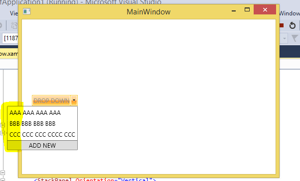 <telerik:RadSplitButton Margin="20,152,0,0" Foreground="#8F8F8F" HorizontalAlignment="Left" VerticalAlignment="Top" Content="DROP DOWN"> <telerik:RadSplitButton.DropDownContent> <StackPanel Orientation="Vertical"> <telerik:RadListBox ItemsSource="{Binding AddressBooks}" BorderThickness="0"> <telerik:RadListBoxItem>AAA AAA AAA AAA</telerik:RadListBoxItem> <telerik:RadListBoxItem>BBB BBB BBB BBB</telerik:RadListBoxItem> <telerik:RadListBoxItem>CCC CCC CCC CCCC CCC</telerik:RadListBoxItem> </telerik:RadListBox> <Button Content="ADD NEW" BorderThickness="0,1,0,0"/> </StackPanel> </telerik:RadSplitButton.DropDownContent></telerik:RadSplitButton>
