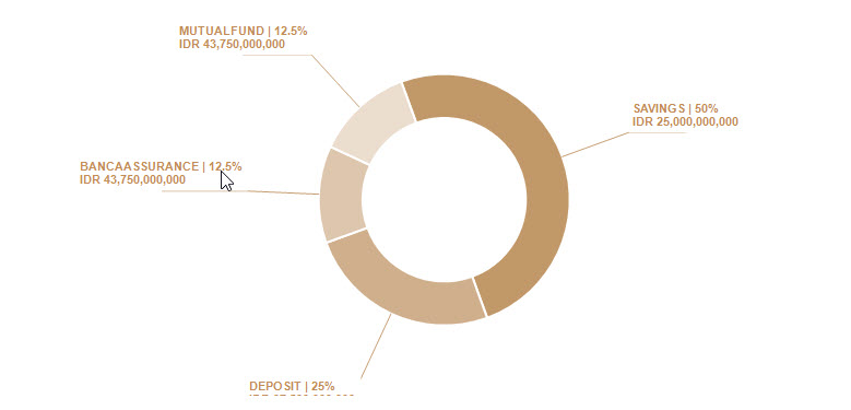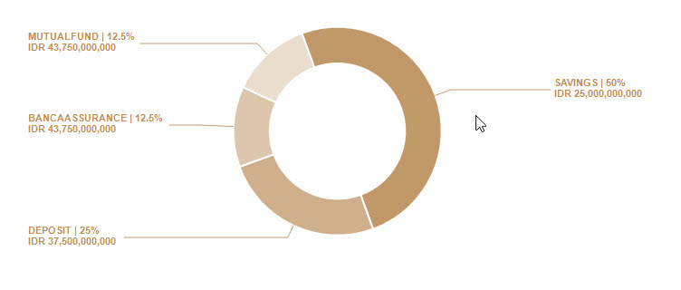private void CreateRadChartDonut(ref string p_strFileName) { RadChartView chartDonut = new RadChartView(); //chartDonut = radChartView1; chartDonut.Size = radChartView1.Size; chartDonut.Dock = DockStyle.Fill; chartDonut.LabelFormatting += radChartView_LabelFormatting; chartDonut.View.Margin = new Padding(65); //set pie padding chartDonut.AreaType = ChartAreaType.Pie; //set to pie chart type chartDonut.Series.Clear(); #region Config New Chart Series Telerik.WinControls.UI.DonutSeries smartPie = new Telerik.WinControls.UI.DonutSeries(); smartPie.Name = "Series"; smartPie.InnerRadiusFactor = 0.35f; //setting inner radious doughnut so it can change as Doughnut Chart smartPie.LabelMode = PieLabelModes.Horizontal; smartPie.ShowLabels = true; //show label text smartPie.DrawLinesToLabels = true; //show label line connector smartPie.LinesToLabelsColor = Color.FromArgb(197, 158, 115); //set label line connector color smartPie.SyncLinesToLabelsColor = false; //set true if we want to set label line color the same as series color //set angle range starting position AngleRange range = smartPie.Range; range.StartAngle = 250; smartPie.Range = range; smartPie.LabelsOffsetFromCenter = 1.56f; #endregion #region Generate Data List<DataChart> lData = new List<DataChart>(); lData.Add(new DataChart("Savings", 50)); lData.Add(new DataChart("Deposit", 25)); lData.Add(new DataChart("BancaAssurance", 12.5)); lData.Add(new DataChart("MutualFund", 12.5)); #endregion //add slice area foreach (DataChart d in lData) { PieDataPoint point = new PieDataPoint(Convert.ToDouble(d.Value), d.Name); point.Label = d.Name.ToUpper(); point.Label = string.Format("{0} | {1}%{2}{3} {4}", d.Name.ToUpper(), d.Value, Environment.NewLine, "IDR", Convert.ToDouble(d.ValueRp).ToString("N0")); smartPie.DataPoints.Add(point); } chartDonut.Series.Add(smartPie); #region Setting Series Slice Color chartDonut.Series[0].Children[0].BackColor = Color.FromArgb(193, 152, 105); chartDonut.Series[0].Children[1].BackColor = Color.FromArgb(207, 175, 140); chartDonut.Series[0].Children[2].BackColor = Color.FromArgb(221, 198, 173); chartDonut.Series[0].Children[3].BackColor = Color.FromArgb(235, 221, 206); chartDonut.Series[0].IsVisible = true; #endregion ExportChart(ref p_strFileName, chartDonut, new Size(690, 360)); }