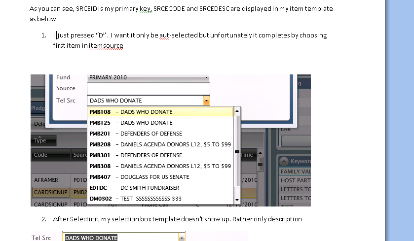 As in my example, item template consists of both code and description (SRCECODE and SRCEDESC). In auto-complete, it matches with the desc and completes it,