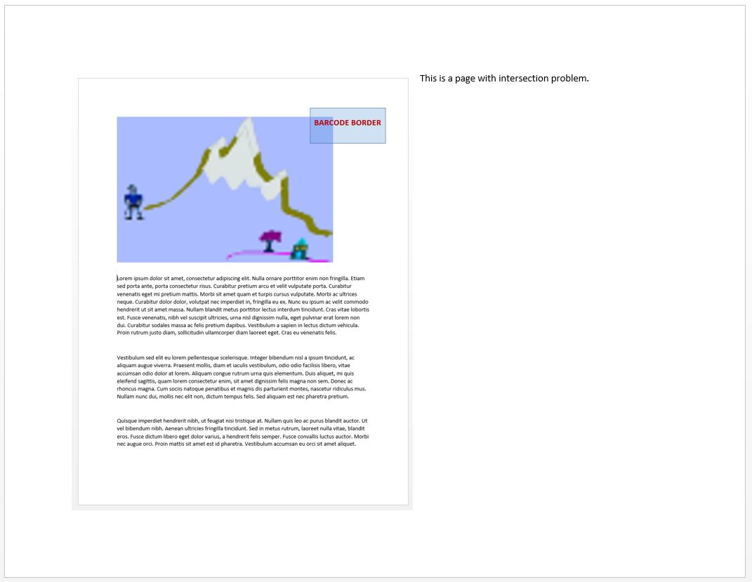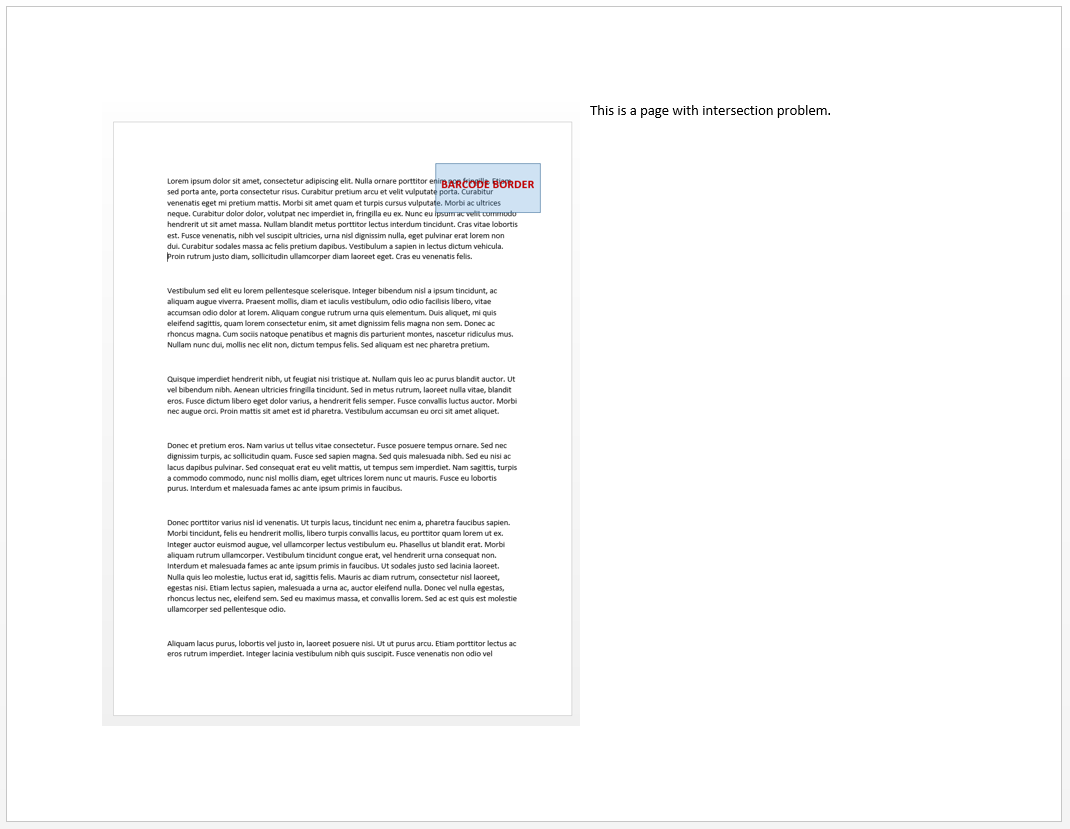 We are exporting the documents created in RadRichTextBox to PDF files. Then we add a Barcode on the upper right of pages as a new layer. We need to check if the Barcode borders intersects with any document element (text, table, image, etc.) in the document.