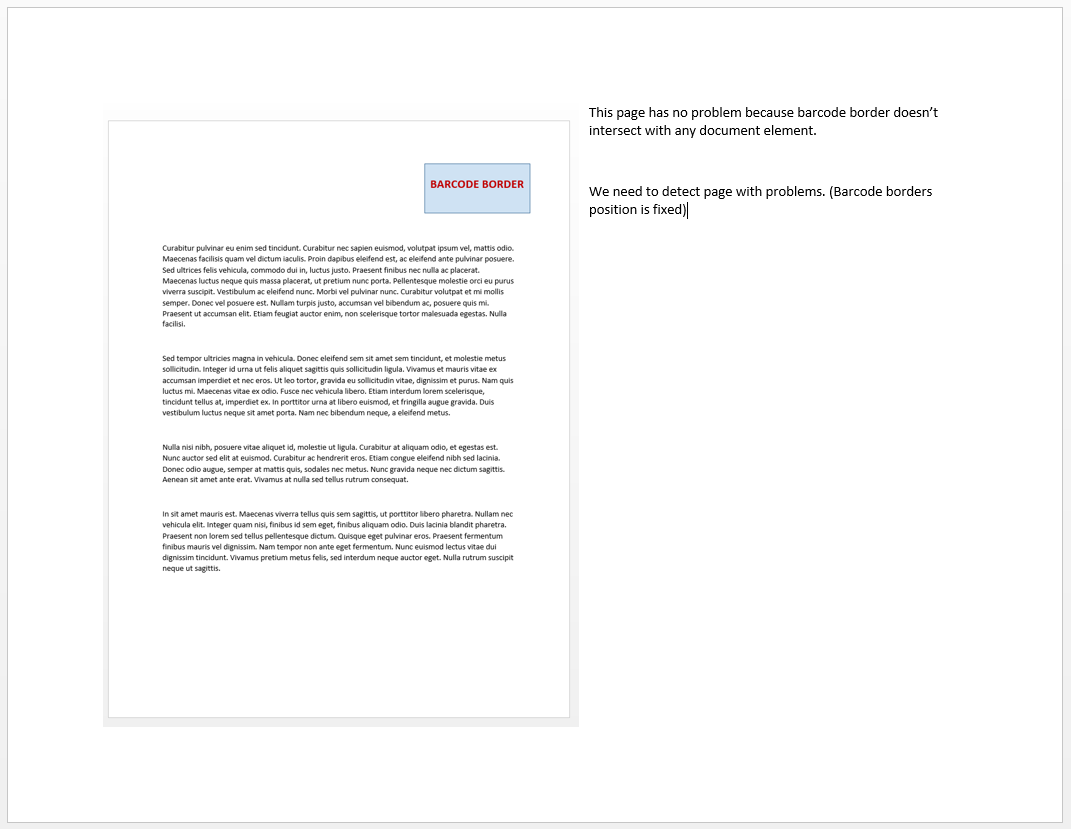 01.for (int i = 2; i <= pageCount; i++)02.{03. RadEditor.Document.CaretPosition.MoveToPage(i);04. RadEditor.Document.CaretPosition.MoveToCurrentLineEnd();05. if ((RadEditor.Document.CaretPosition.Location.X) > 700 && (RadEditor.Document.CaretPosition.Location.Y) < 100)06. {07. // barcode border intersects with the text in the document08. }09.}Second Approach: We can use GetLayoutBoxByPosition method to check if there is an element at the coordinates we will add Barcode border.