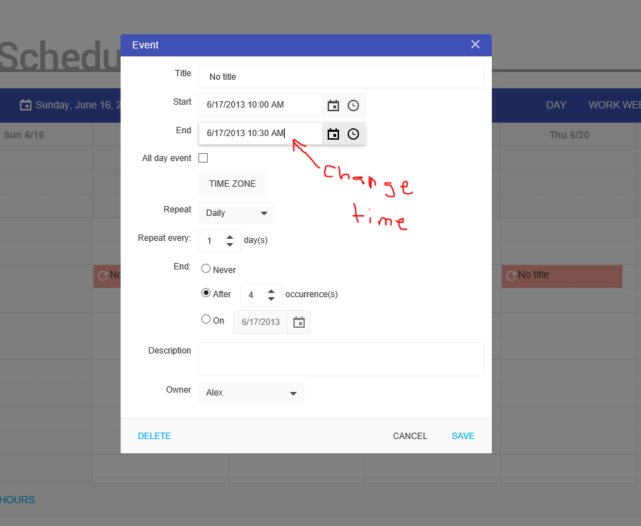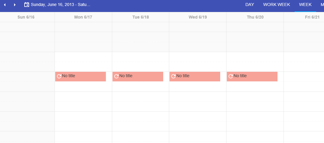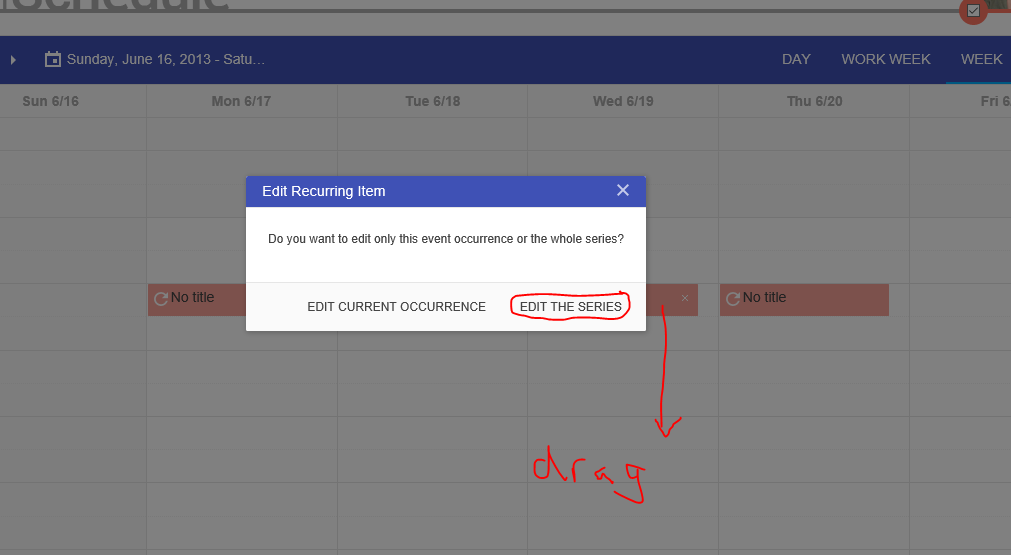 After creating a recurring event, if you double click on one event in the series and select "Edit Series", you can change all the details of the recurring event. If you only change the time, all the events in the recurrence move to that time. As expected. The Start Date stays the same, by default. If you go into week view and drag any of the recurring events except for the first one to a new time and select "Edit Series" it starts the recurrence pattern on the selected date instead of just changing the times of all the events.