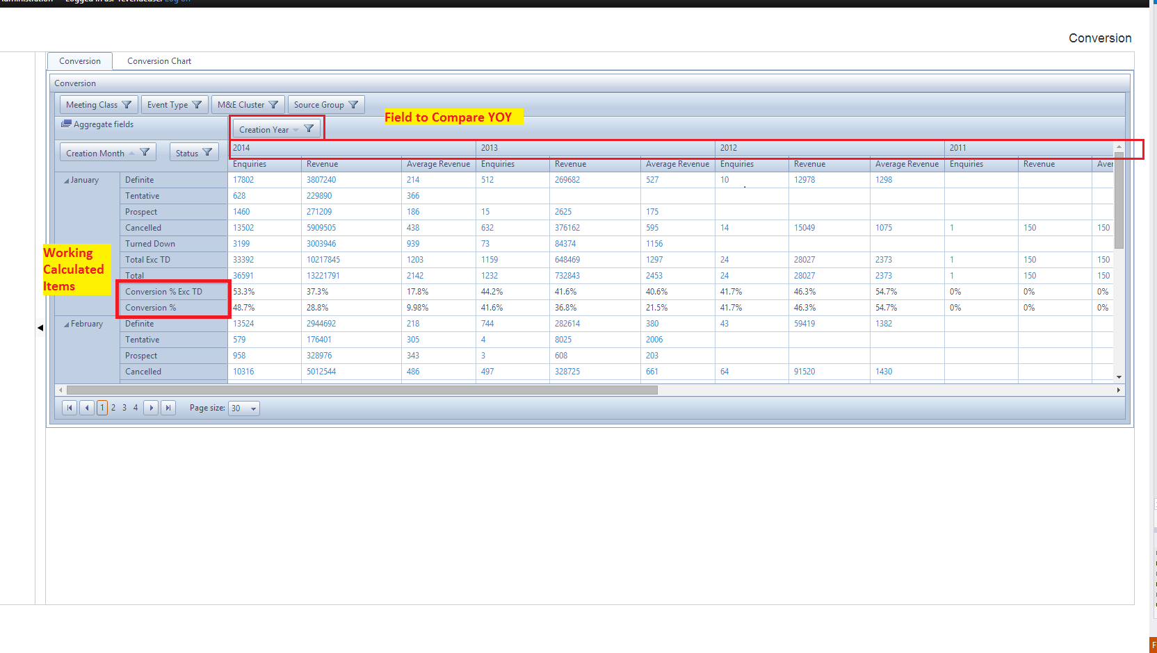 <telerik:RadPivotGrid ID="RadPivotGrid_DataView" runat="server" Height="100%" AllowSorting="True" OnItemCommand="RadPivotGrid_DataView_ItemCommand" OnCellCreated="RadPivotGrid_DataView_CellCreated" DataSourceID="Sql_Contract_Details" EnableToolTips="True" EnableZoneContextMenu="True" EnableConfigurationPanel="True" OnFieldCreated="RadPivotGrid_DataView_FieldCreated" Skin="Office2010Blue" OnCellDataBound="RadPivotGrid_DataView_CellDataBound" Culture="en-GB" OnItemNeedCalculation="RadPivotGrid_DataView_ItemNeedCalculation" AllowPaging="True" PageSize="30" AggregatesLevel="1"> <FieldsPopupSettings AggregateFieldsMinCount="1" /> <PagerStyle ChangePageSizeButtonToolTip="Change Page Size" PageSizeControlType="RadComboBox" /> <OlapSettings> <XmlaConnectionSettings></XmlaConnectionSettings> </OlapSettings> <Fields> <telerik:PivotGridReportFilterField Caption="Meeting Class" DataField="MeetingClass" UniqueName="MeetingClass" IsHidden="false"> </telerik:PivotGridReportFilterField> <telerik:PivotGridReportFilterField Caption="Event Type" DataField="EventType" UniqueName="EventType" IsHidden="false"> </telerik:PivotGridReportFilterField> <telerik:PivotGridReportFilterField Caption="M&E Cluster" DataField="M_and_E_Cluster" UniqueName="M_and_E_Cluster" IsHidden="false"> </telerik:PivotGridReportFilterField> <telerik:PivotGridReportFilterField Caption="Source Group" DataField="LeadSource" UniqueName="LeadSource" IsHidden="false"> </telerik:PivotGridReportFilterField> <telerik:PivotGridColumnField Caption="Creation Year" SortOrder="Descending" DataField="CreatedDate" GroupInterval="Year" UniqueName="CreationDateYear" IsHidden="false"> <%--THIS CAUSES "Object reference not set to an instance of an object" ERROR <CalculatedItems> <telerik:PivotGridCalculatedItem GroupName="Forecast for 1999"></telerik:PivotGridCalculatedItem> </CalculatedItems> --%> </telerik:PivotGridColumnField> <telerik:PivotGridRowField Caption="Creation Month" DataField="CreatedDate" GroupInterval="Month" UniqueName="CreationDateMonth" IsHidden="false"> </telerik:PivotGridRowField> <telerik:PivotGridColumnField Caption="Arrival Year" SortOrder="Descending" DataField="EventStartDate" GroupInterval="Year" UniqueName="ArrivalYear" IsHidden="true"> </telerik:PivotGridColumnField> <telerik:PivotGridRowField Caption="Arrival Month" DataField="EventStartDate" GroupInterval="Month" UniqueName="ArrivalMonth" IsHidden="true"> </telerik:PivotGridRowField> <telerik:PivotGridRowField Caption="Status" DataField="StatusText" UniqueName="StatusText" IsHidden="false" SortOrder="None"> <CalculatedItems> <telerik:PivotGridCalculatedItem GroupName="Total Exc TD"></telerik:PivotGridCalculatedItem> <telerik:PivotGridCalculatedItem GroupName="Total"></telerik:PivotGridCalculatedItem> <telerik:PivotGridCalculatedItem GroupName="Conversion % Exc TD"></telerik:PivotGridCalculatedItem> <telerik:PivotGridCalculatedItem GroupName="Conversion %"></telerik:PivotGridCalculatedItem> </CalculatedItems> </telerik:PivotGridRowField> <telerik:PivotGridAggregateField DataField="RecordCount" Aggregate="Count" Caption="Enquiries" IsHidden="false"> </telerik:PivotGridAggregateField> <telerik:PivotGridAggregateField DataField="TotalFunctionRevenue" Aggregate="Sum" Caption="Revenue" IsHidden="false" DataFormatString="{0:C0}"> </telerik:PivotGridAggregateField> <telerik:PivotGridAggregateField DataField="TotalFunctionRevenue" Aggregate="Average" Caption="Average Revenue" IsHidden="false" DataFormatString="{0:C0}"> </telerik:PivotGridAggregateField> <telerik:PivotGridAggregateField DataField="RecordCount" Caption="YOY" IsHidden="false"> <TotalFormat Axis="Columns" TotalFunction="DifferenceFromPrevious" /> </telerik:PivotGridAggregateField> </Fields> <ClientSettings EnableFieldsDragDrop="True"> <Scrolling AllowVerticalScroll="True"></Scrolling> </ClientSettings> <TotalsSettings RowsSubTotalsPosition="None" RowGrandTotalsPosition="None" ColumnsSubTotalsPosition="None" ColumnGrandTotalsPosition="None"></TotalsSettings> <ConfigurationPanelSettings EnableOlapTreeViewLoadOnDemand="True" DefaultDeferedLayoutUpdate="True" LayoutType="OneByFour"></ConfigurationPanelSettings> </telerik:RadPivotGrid>Many Thanks.