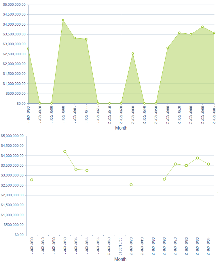 I'm allowing the user to create charts and change the chart type (line, area, bar, pie, etc) on the fly. With the new Date axis I'm experiencing a problem with the line chart. It doesn't connect the lines when there is a gap in the data like the area chart does. When XAxis.Type is set to AxisType.Category it works fine. Is this by design, or a bug. Is there a workaround besides filling the data source with dummy data for the months that don't have any metrics. Screenshot of the problem is attached.