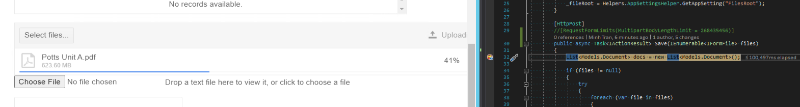 Unsure if this is related to uploading large files considering the issue is not seen when uploading <500mb files but when attempting to upload a 600mb file, the POST method is firing before the file even reaches 50% upload resulting in a null IEnumerable<IFormFile>. When the file does finish its upload, the completion handler fires immediately.