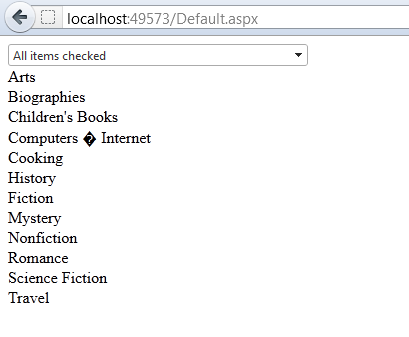 <%@ Page Language="C#" AutoEventWireup="true" CodeBehind="Default.aspx.cs" Inherits="Default" %><!DOCTYPE html PUBLIC "-//W3C//DTD XHTML 1.0 Transitional//EN" "http://www.w3.org/TR/xhtml1/DTD/xhtml1-transitional.dtd"><html xmlns="http://www.w3.org/1999/xhtml"><head runat="server"> <title></title> <telerik:RadStyleSheetManager id="RadStyleSheetManager1" runat="server" /></head><body> <form id="form1" runat="server"> <telerik:RadScriptManager ID="RadScriptManager1" runat="server"> <Scripts> <%--Needed for JavaScript IntelliSense in VS2010--%> <%--For VS2008 replace RadScriptManager with ScriptManager--%> <asp:ScriptReference Assembly="Telerik.Web.UI" Name="Telerik.Web.UI.Common.Core.js" /> <asp:ScriptReference Assembly="Telerik.Web.UI" Name="Telerik.Web.UI.Common.jQuery.js" /> <asp:ScriptReference Assembly="Telerik.Web.UI" Name="Telerik.Web.UI.Common.jQueryInclude.js" /> </Scripts> </telerik:RadScriptManager> <script type="text/javascript"> function IsCheckAllSelected(sender, eventArgs) { var itemCount = sender.get_items().get_count(); var selectedItemCount = sender.get_checkedItems().length; if (selectedItemCount == itemCount) { alert('check-all was checked') __doPostBack('RadComboBox1', 'Check All'); } else { return 0 } } </script> <telerik:RadAjaxManager ID="RadAjaxManager1" runat="server"> </telerik:RadAjaxManager> <div> <telerik:RadComboBox ID="RadComboBox1" runat="server" CheckBoxes="true" EnableCheckAllItemsCheckBox="true" Width="300px" OnClientBlur="IsCheckAllSelected" > <items> <telerik:RadComboBoxItem Text="Arts" /> <telerik:RadComboBoxItem Text="Biographies" /> <telerik:RadComboBoxItem Text="Children's Books" /> <telerik:RadComboBoxItem Text="Computers � Internet" /> <telerik:RadComboBoxItem Text="Cooking" /> <telerik:RadComboBoxItem Text="History" /> <telerik:RadComboBoxItem Text="Fiction" /> <telerik:RadComboBoxItem Text="Mystery" /> <telerik:RadComboBoxItem Text="Nonfiction" /> <telerik:RadComboBoxItem Text="Romance" /> <telerik:RadComboBoxItem Text="Science Fiction " /> <telerik:RadComboBoxItem Text="Travel" /> </items> </telerik:RadComboBox> </div> <asp:Label ID="itemsClientSide" runat="server" Text=""></asp:Label> </form></body></html>Default.aspx.cs: