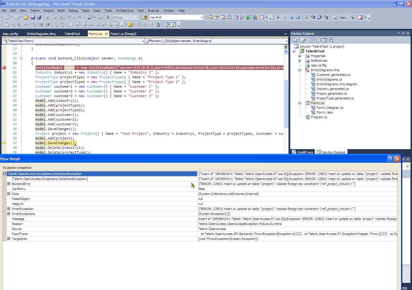 {"Insert of '1893964241-' failed: Telerik.OpenAccess.RT.sql.SQLException: ERROR: 23503: insert or update on table \"project\" violates foreign key constraint \"ref_project_industry\"\r\n at Telerik.OpenAccess.RT.Adonet2Generic.Impl.PreparedStatementImp.execute()\r\n at OpenAccessRuntime.Relational.conn.PooledPreparedStatement.execute()\r\n at OpenAccessRuntime.Relational.RelationalStorageManager.generateInserts(NewObjectOID oid, Int32 index, ClassMetaData cmd, PersistGraph graph, Int32[] fieldNos, CharBuf s, Object[] oidData, IntArray toUpdateIndexes)\nINSERT INTO \"project\" (\"id4\", \"id2\", \"nme\", \"id3\") VALUES (?, ?, ?, ?)\n(set event logging to all to see parameter values) Telerik.OpenAccess.RT.sql.SQLException: ERROR: 23503: insert or update on table \"project\" violates foreign key constraint \"ref_project_industry\"\r\n at Telerik.OpenAccess.RT.Adonet2Generic.Impl.PreparedStatementImp.execute()\r\n at OpenAccessRuntime.Relational.conn.PooledPreparedStatement.execute()\r\n at OpenAccessRuntime.Relational.RelationalStorageManager.generateInserts(NewObjectOID oid, Int32 index, ClassMetaData cmd, PersistGraph graph, Int32[] fieldNos, CharBuf s, Object[] oidData, IntArray toUpdateIndexes)"}
