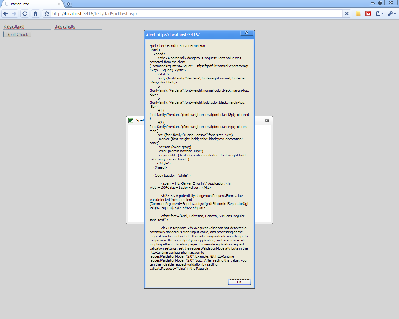 I am getting a popup with "Error 500: Potentially Dangerous Request" when trying to use RadSpell on multiple controls in ASP.NET 4. The error occurs the moment I click "Check Spell".